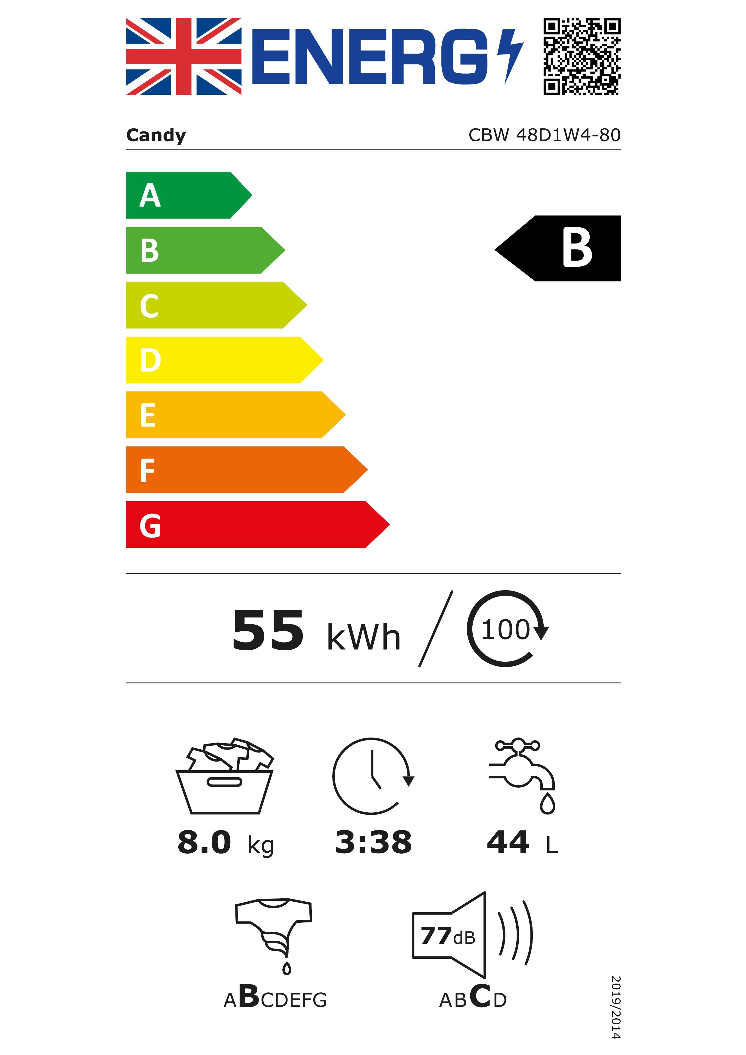 With a maximum spin speed of 1400 rpm, Candy's CBW48D1W4-80 efficiently removes excess water, reducing drying time. It has a weighted energy consumption of 55 kWh per 100 cycles and a water consumption of 44 litres per cycle. The noise level during spinning is 77 dB, classified under airborne acoustical noise emission class C, ensuring relatively quiet operation.