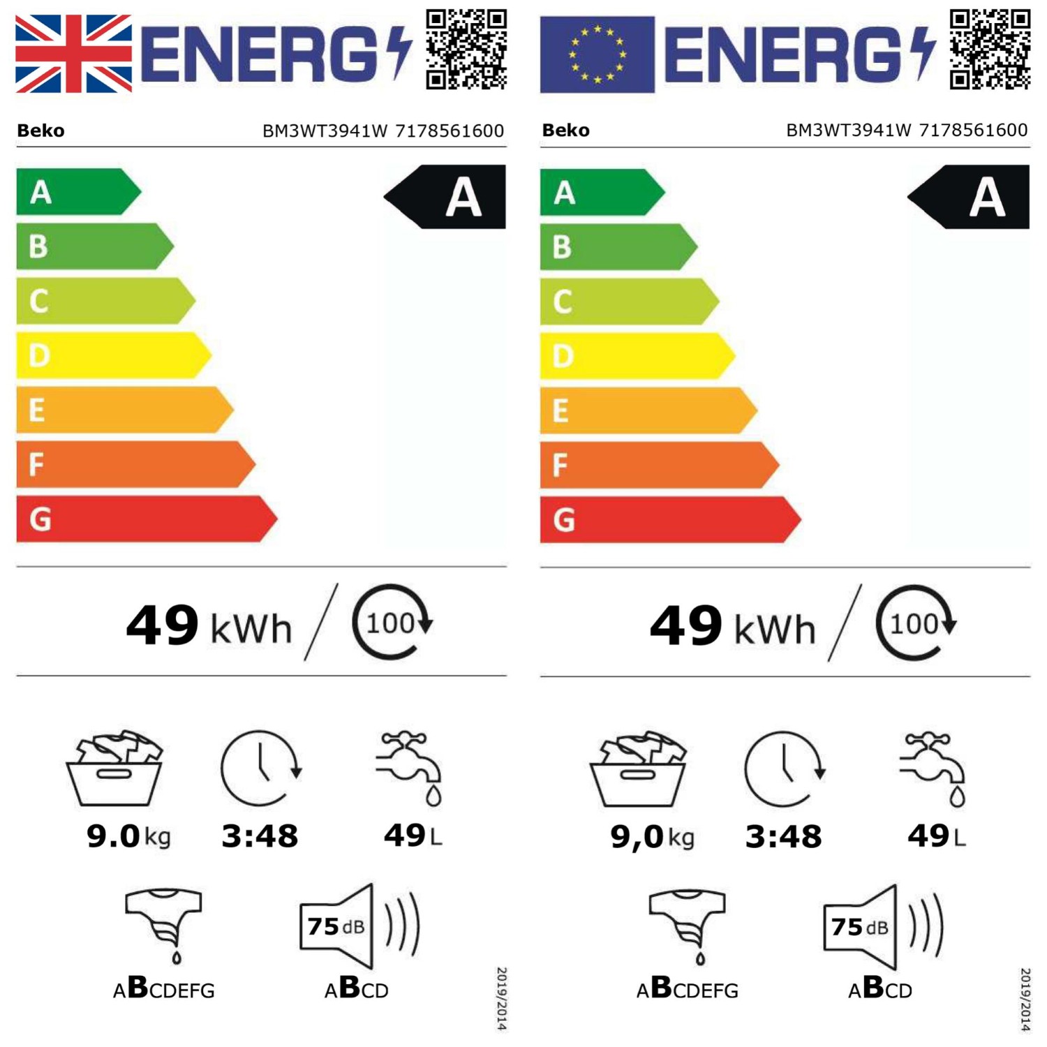 Rated with an energy efficiency class A, Beko's BM3WT3941W is designed to heavily reduce power consumption, with an annual energy rating of 49 kWh. It also features a child lock and out of balance protection for added safety. The automatic load recognition and digital inverter motor further enhance its efficiency, ensuring optimal performance with every wash.