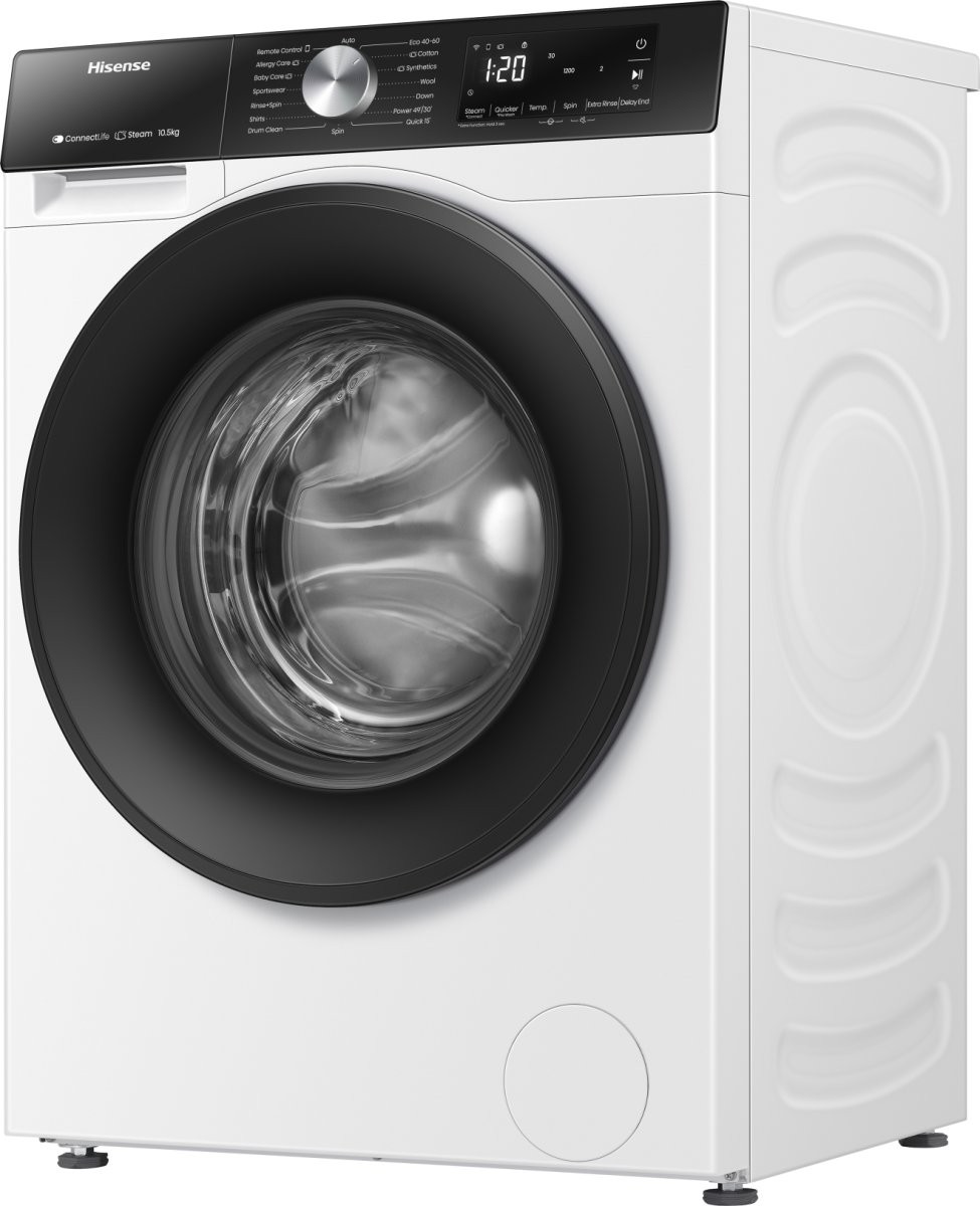 The WF3S1043BW3 boasts an impressive A energy efficiency rating, helping to save on utility bills, all while keeping your clothes absolutely spotless. With a maximum 10.5kg load capacity and 1400 rpm spin speed, Hisense's WF3S1043BW3 provides excellent large capacity performance. Its well engineered inverter motor ensures quiet operation and long lasting durability, setting new standards for household washing machine expectations.