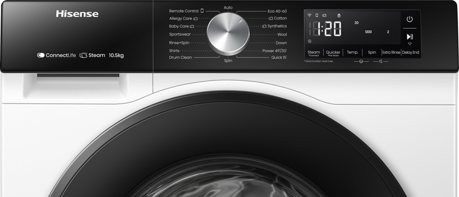 Hisense's Hygiene Guard technology utilises an antibacterial rubber seal for enhanced cleanliness while the Pure Jet function keeps the machine door and door seal free from stains. Even better, the steam wash effectively removes bacteria and reduces creases, ensuring your clothes comes out fresh, clean, and wrinkle free.