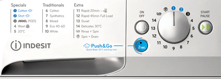 Push&Go is a notable feature, allowing you to wash and soften clothes while reducing creases in just one hour. This technology cuts ironing time by 30%, making doing the laundry less of a chore. An Ariel PODS Cycle simplifies detergent dosing and cycle setting, ensuring brilliantly clean clothes at 30°C in just one hour.