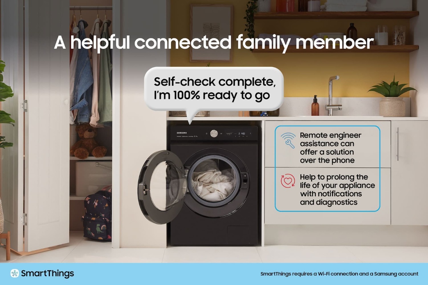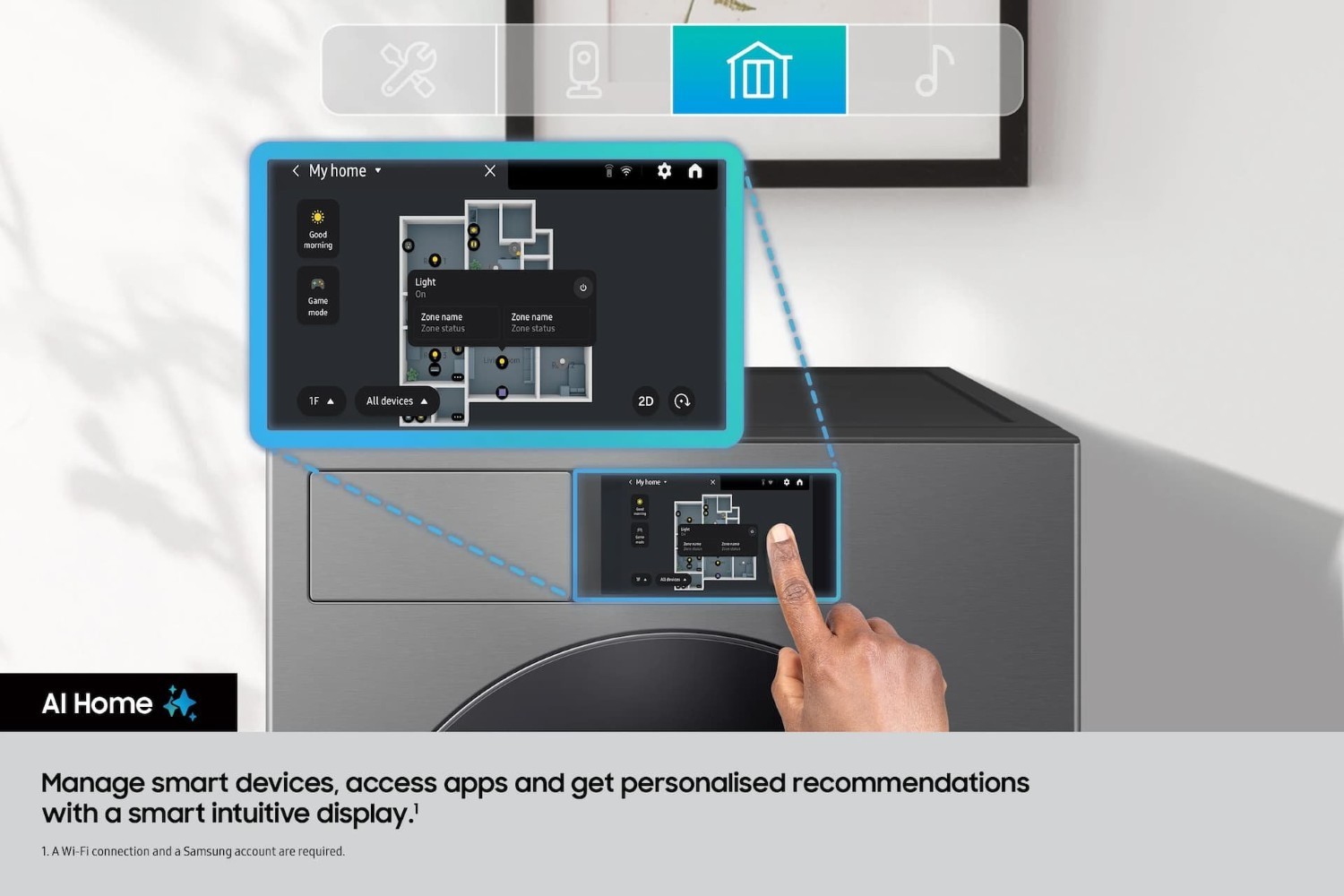 Equipped with support for Samsung's SmartThings app, the WF90F09C4SU1 lets you remotely monitoring and control it. Users can receive helpful notifications about laundry progress, and the app can even suggest optimal washing programs based on your preferences. AI Home personalises the washing experience, remembering and keeping track of your habits to provide timely reports about energy and program usage.
