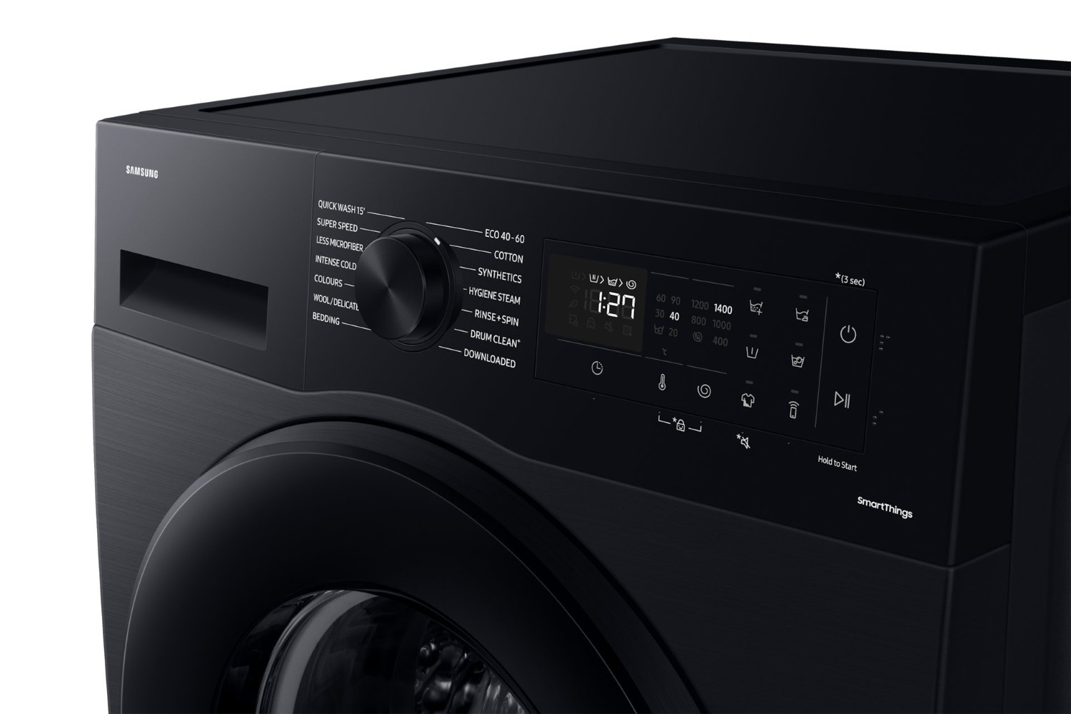 With an impressive 11kg capacity, Samsung's WW11DG5B25ABEU can handle large loads, making it perfect for families. The SpaceMax design philosophy allows for a spacious drum without increasing the machine's overall dimensions, ensuring it fits comfortably in your home. The machine's classic black finish adds a modern touch to any laundry room.