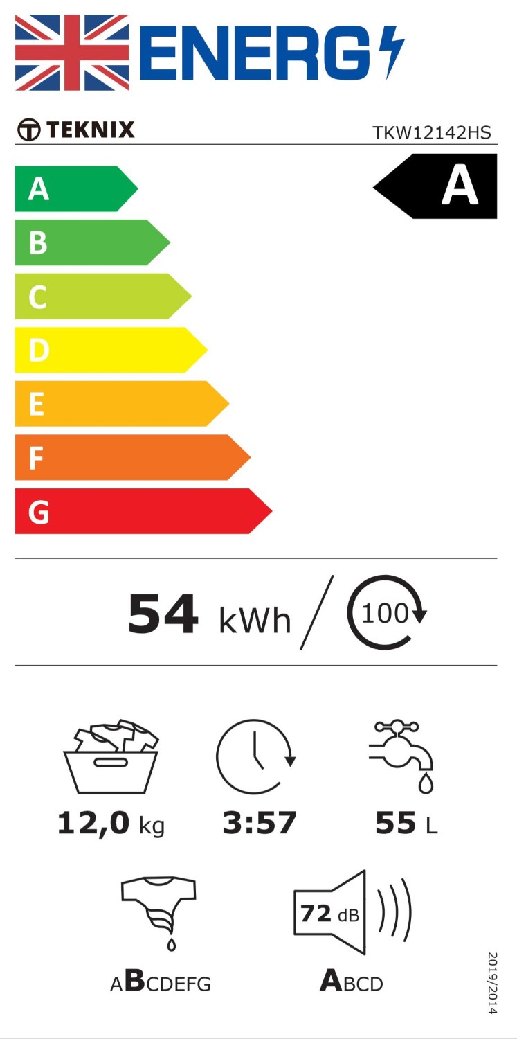With a generous 12kg maximum load capacity, the TKW12142HS is ideal for large families or those with substantial laundry needs. The 1400 spin speed ensures that clothes come out drier, reducing drying time and energy consumption. Its A rated energy efficiency means you can enjoy powerful performance while keeping energy costs low.
