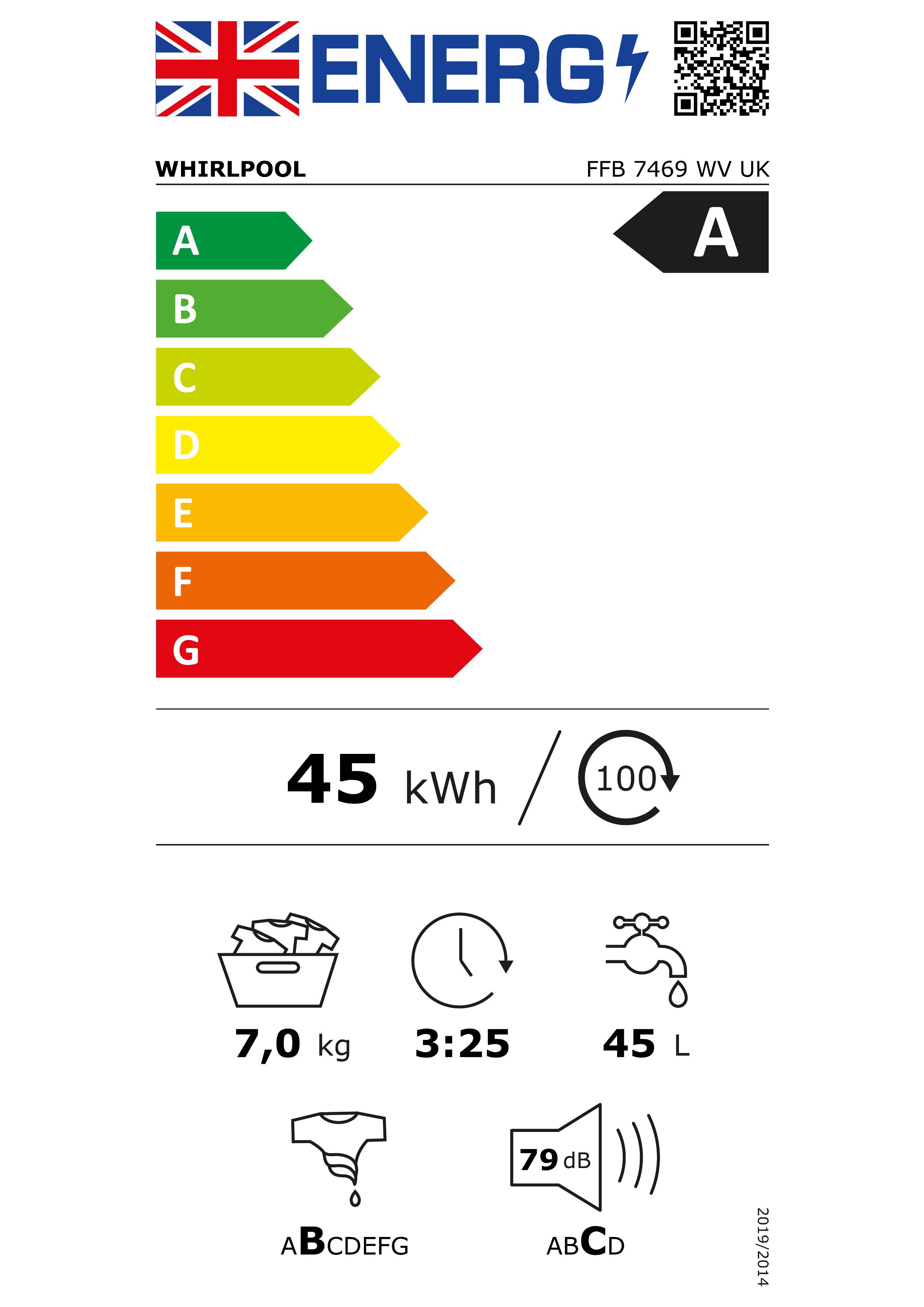 Whirlpool's FFB7469WVUK achieves an impressive A energy rating, exemplifying ideal energy efficiency, and reducing your electricity bills while minimising environmental impact.