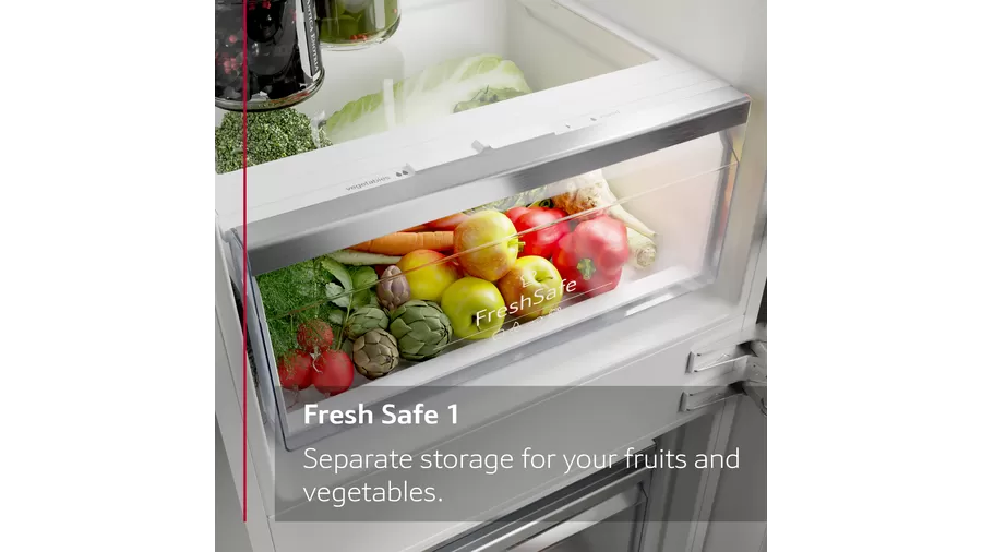 Equipped with Eco Air Flow, the appliance ensures even air distribution throughout the fridge, maintaining consistent temperatures and helping to preserve food quality. The Fresh Safe 1 drawer is designed to keep fruit and vegetables fresh for longer.