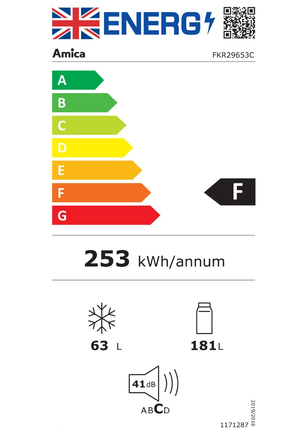 This fridge freezer has an energy efficiency class of F, ensuring it operates efficiently while keeping your energy bills in check. It also has a noise level of 41 dB, making it a quiet addition to your kitchen.