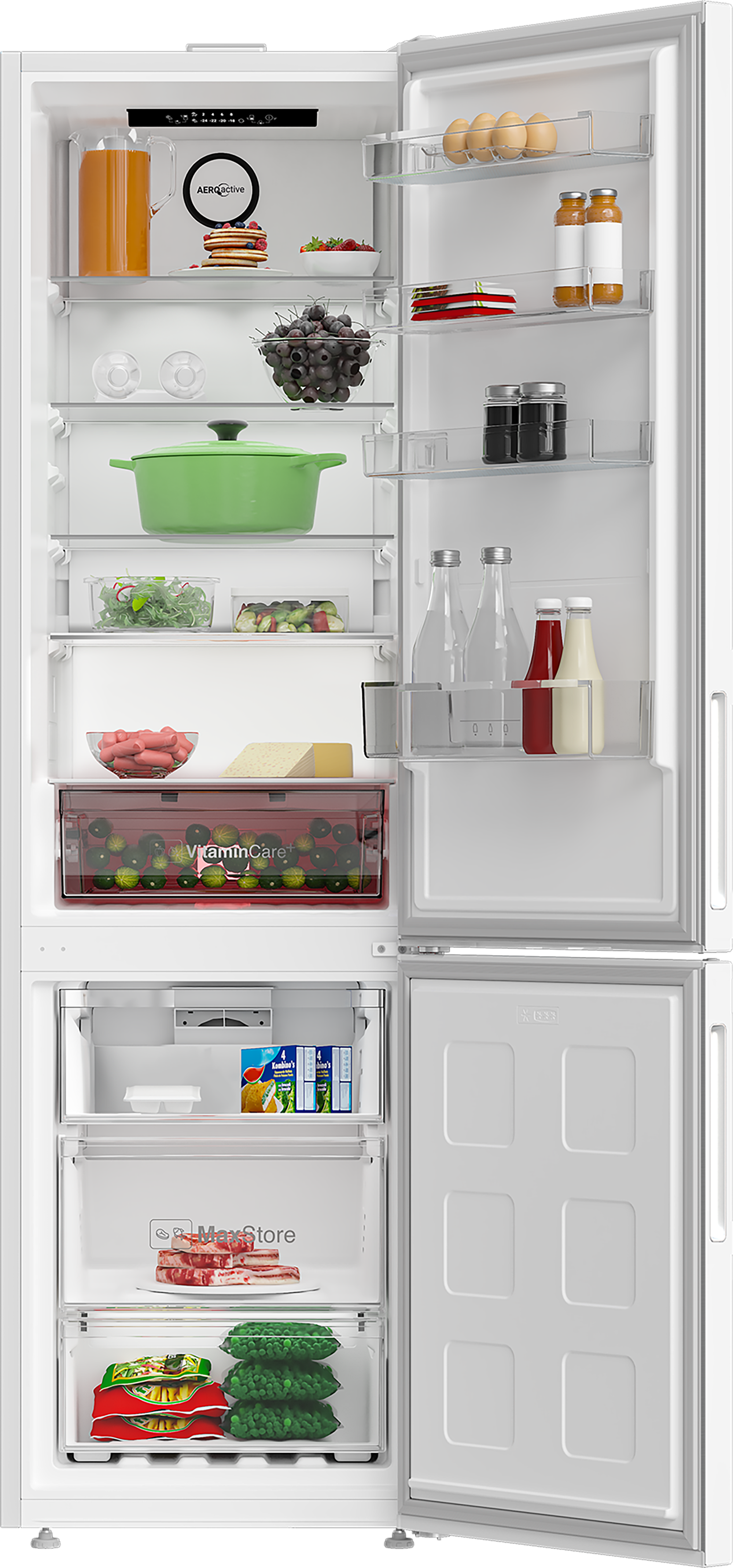 With a total net capacity of 355 liters, this fridge freezer provides plenty of space for your groceries. The refrigerator offers 249 liters of storage with five adjustable shelves, four door bins, and one crisper drawer, allowing you to organise your food conveniently. The freezer section, with a net capacity of 106 liters, includes three drawers for easy access to your frozen goods. The 70/30 split design ensures ample refrigerator space for fresh food storage.