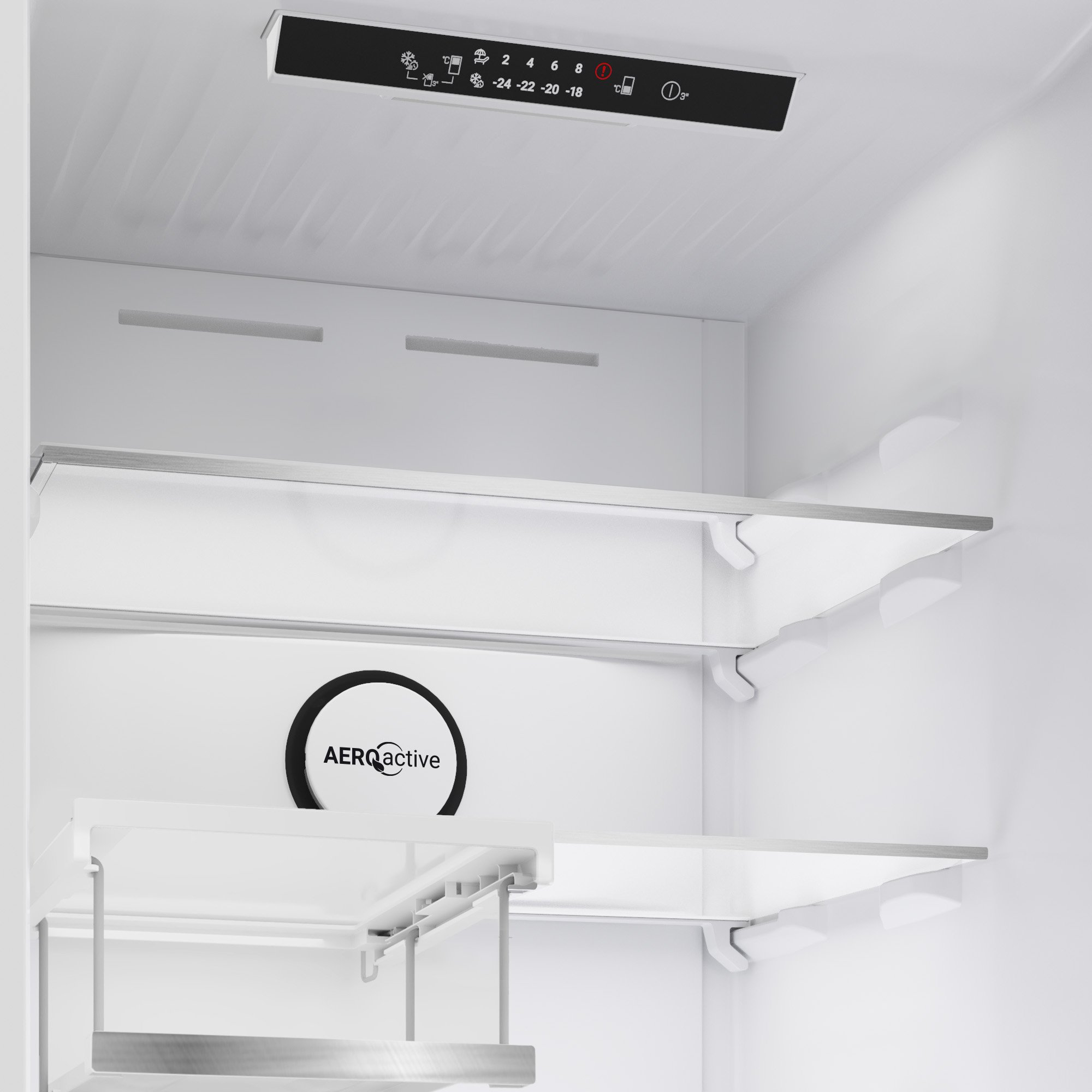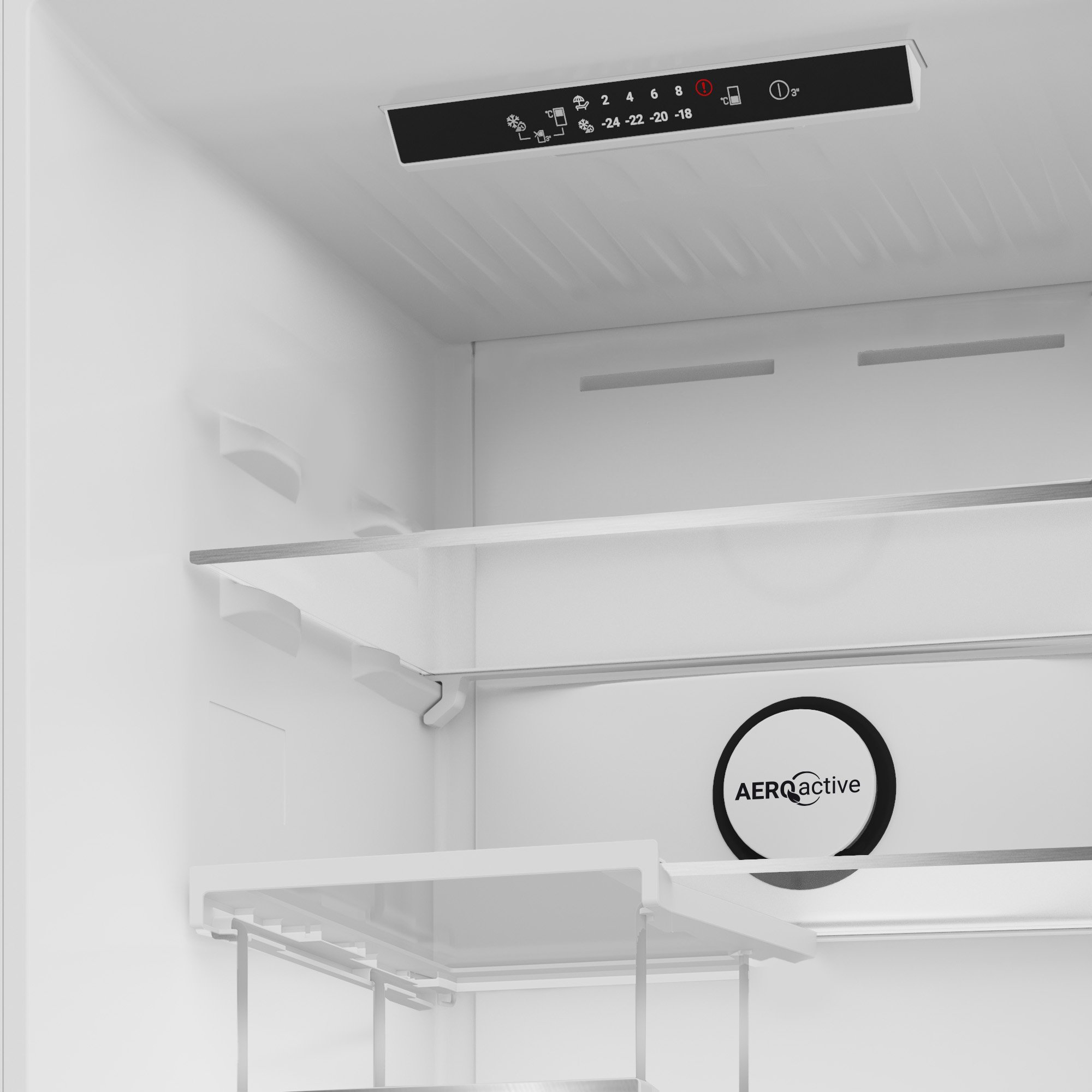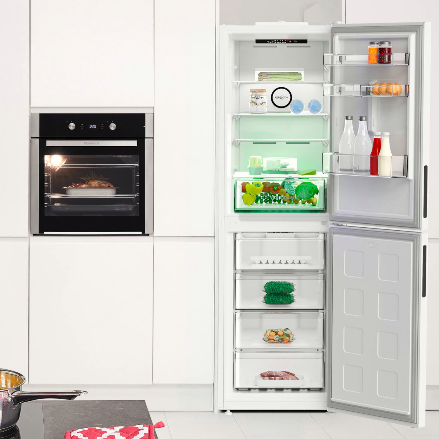 The Blomberg KND24692V features VitaminCare+ technology, which uses blue light to simulate natural light conditions inside the refrigerator. This helps maintain the vitamin content in your fruits and vegetables, ensuring they stay fresh and nutritious for longer. The AeroActive Dual NoFrost technology prevents ice build-up in both the fridge and freezer compartments, reducing the need for manual defrosting and ensuring optimal performance at all times.