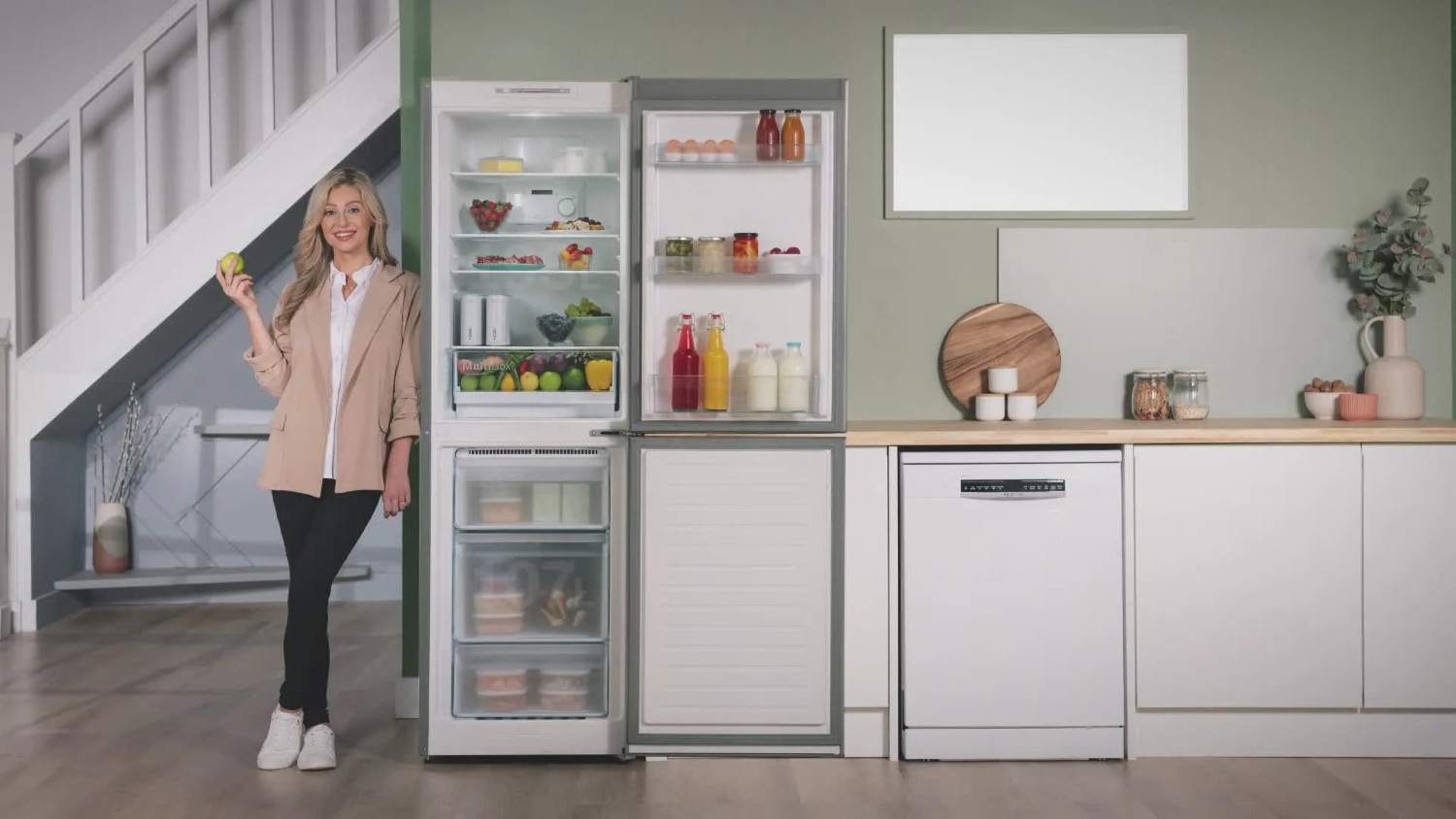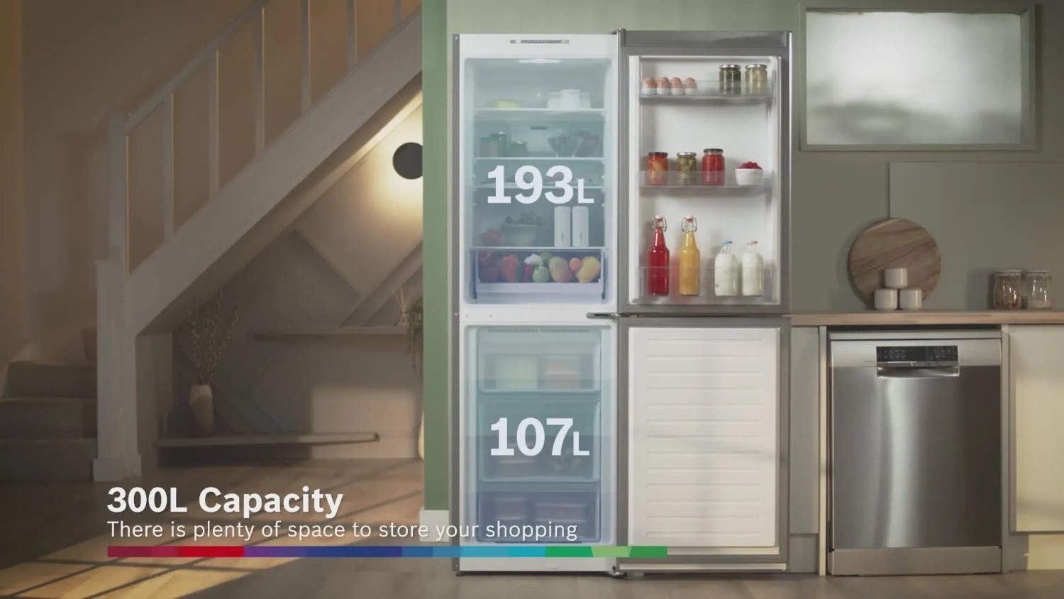 This fridge freezer has 300 litres of usable space, with 193 litres dedicated to the fridge compartment and 107 litres to the freezer compartment. It includes four shelves (two of which are adjustable) in the fridge compartment and three spacious freezing drawers, allowing for highly organised and efficient cold storage. The Multi Box is perfect for keeping fruits and vegetables fresher for longer.