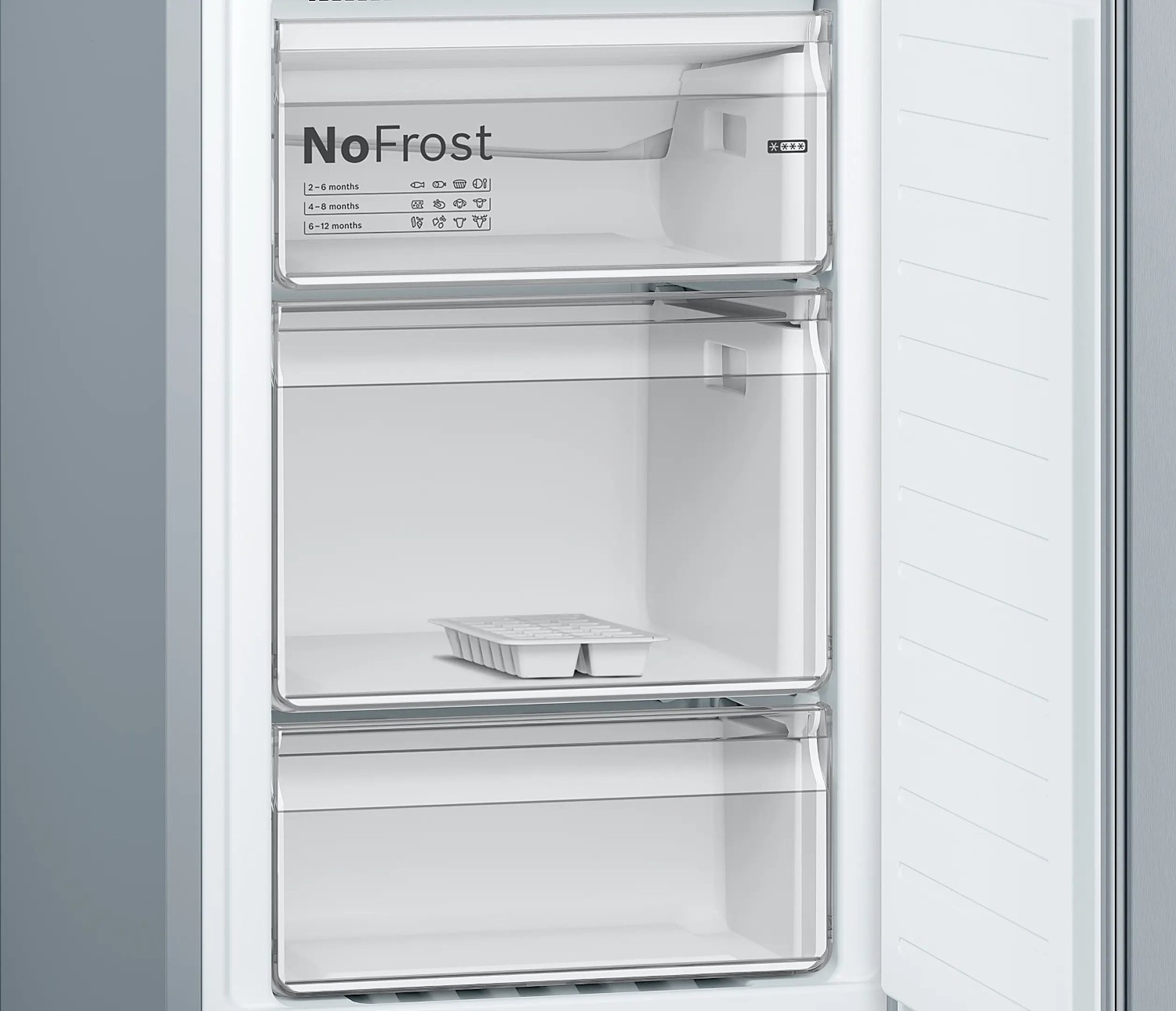 Bosch's KGN34NLEAG fridge freezer has a classic stainless steel finish that blends into any kitchen. The recessed horizontal handle is practical, yet space saving, and the reversible door hinge provides extra flexibility when deciding on placement. The included ice cube tray even has a lid, another nice touch by Bosch.