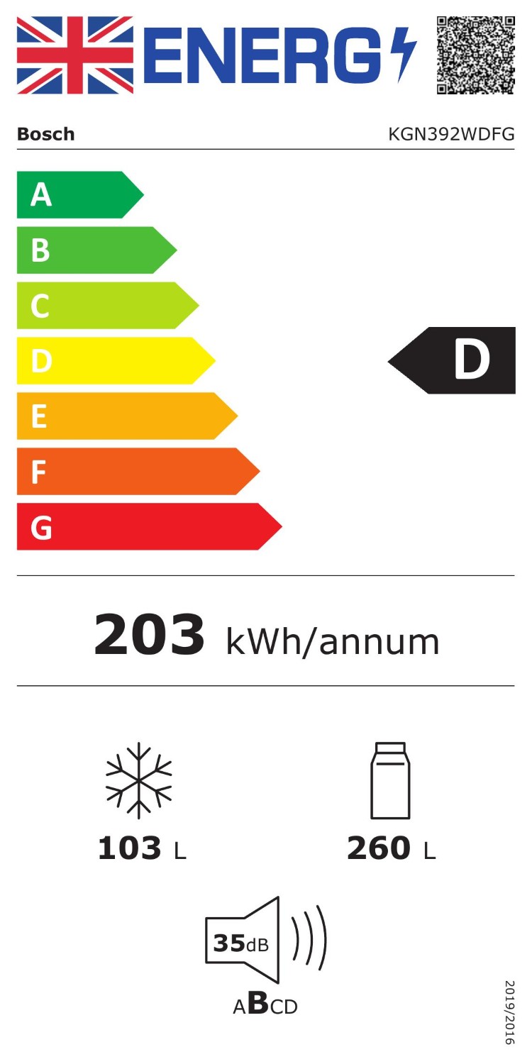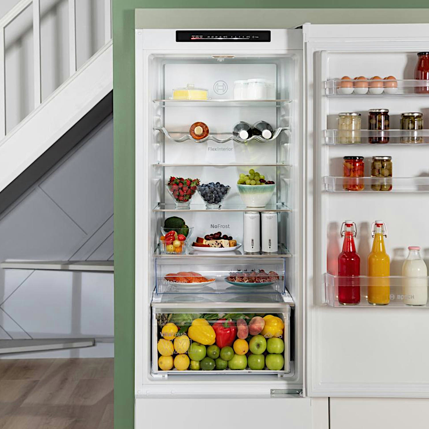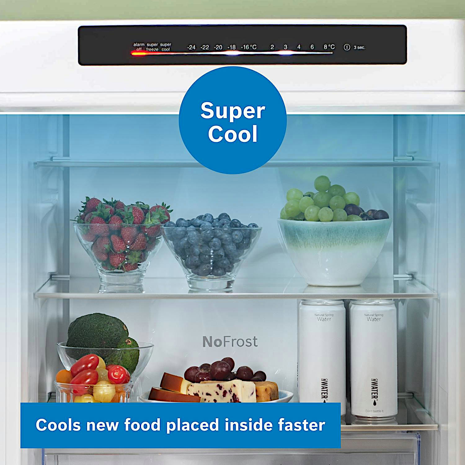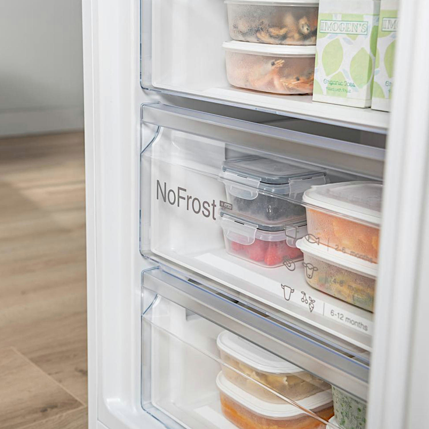 Lock in freshness using this Bosch series 4 fridge freezer. The VitaFresh XXL Pro storage compartment offers the perfect storage environment for all your fresh food thanks to climate control and 0°C technology. Fish and meat stay fresher for longer and fruit and vegetables benefit from an optimised climate. Featuring NoFrost technology, you’ll never have to worry about manually defrosting the KGN392WDFG or ice build up taking up space. Plus, with LED lighting, finding your favourite foods has never been easier.
