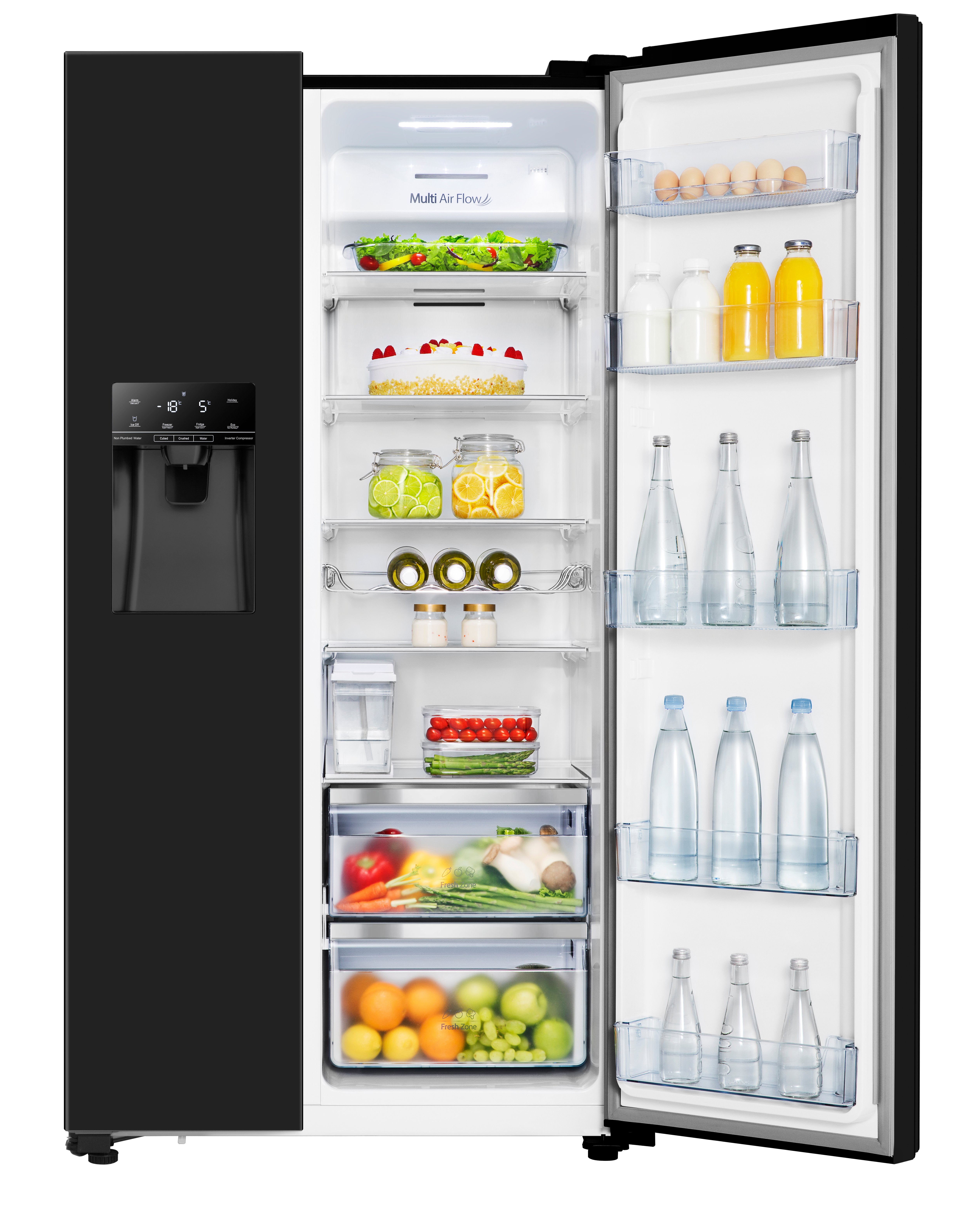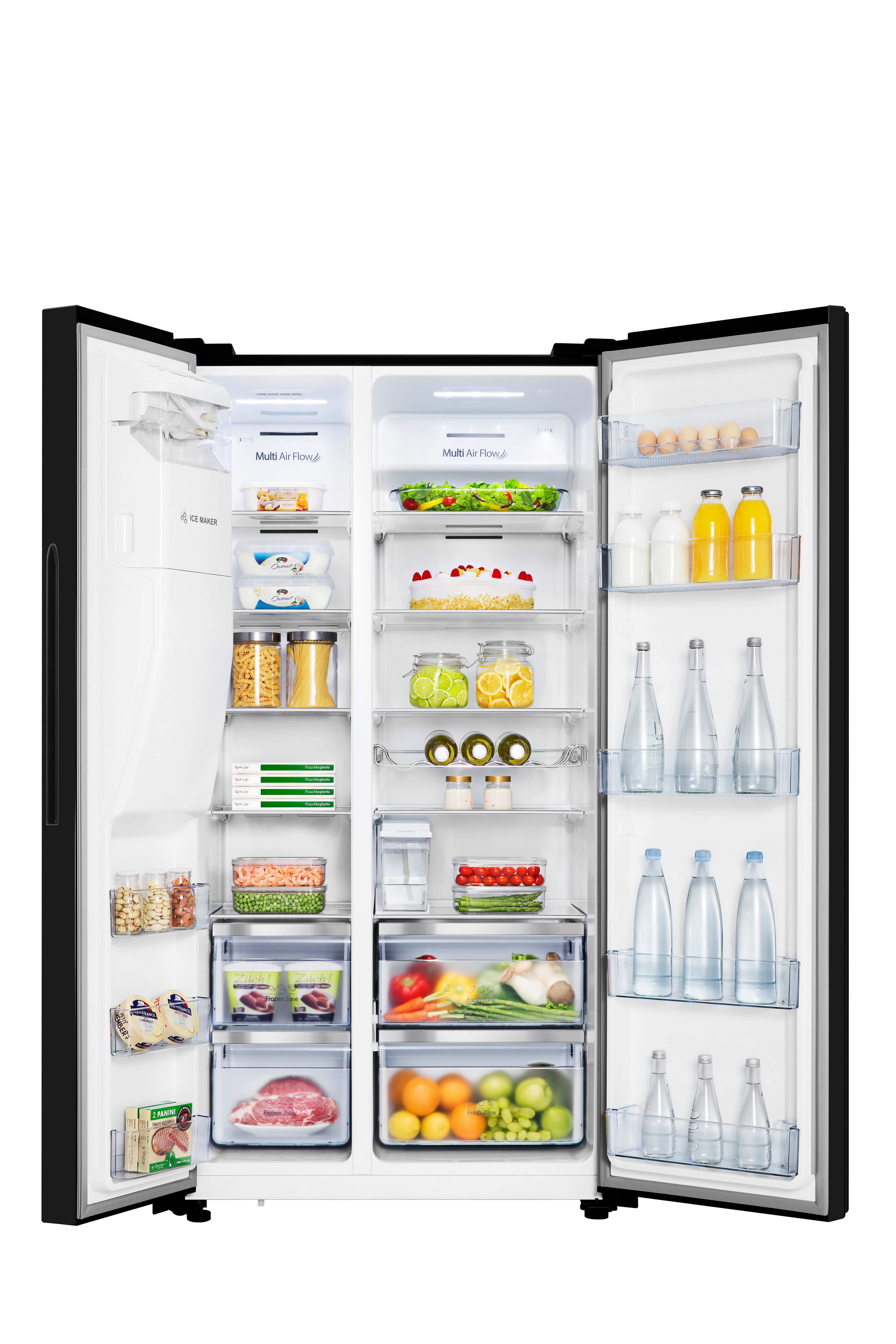 Keep the grocery shopping chilled to perfection with the Hisense RS694N4TBE American Style Fridge Freezer. Buy yours from G Craggs today.