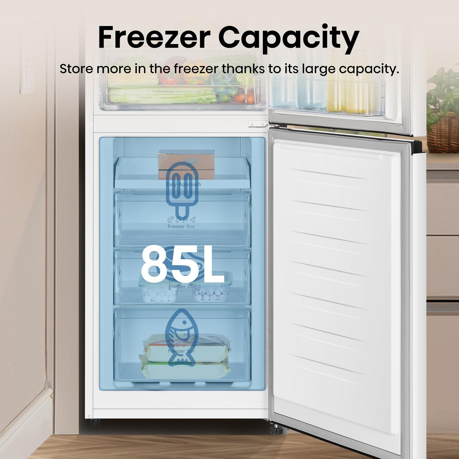The freezer compartment contains 3 clear drawers, for the convenient organisation of your frozen goods. The net capacity is 85 litres, providing you with more than enough space to stock up on those irresistible buy one, get one free offers. Plus, this model comes with an easy approach tray. With an extra 100mm of opening space, organising, and removing large items such as pizza boxes is effortless, even when the upper fridge door is closed.