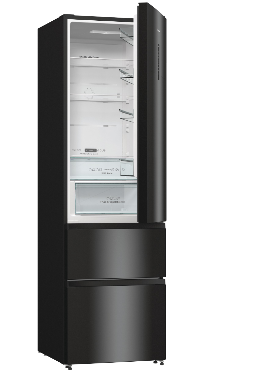 The RM469N4AFDUK boasts a total net capacity of 368L, with 255L dedicated to the refrigerator and 113L to the freezer. Total No Frost (frost free) technology ensures that you never have to manually defrost, while the Multi Air Flow system maintains consistent temperatures throughout the appliance, keeping your food fresh for longer. The XL Door Balcony and adjustable shelves provide flexible storage options for large items and various food types.