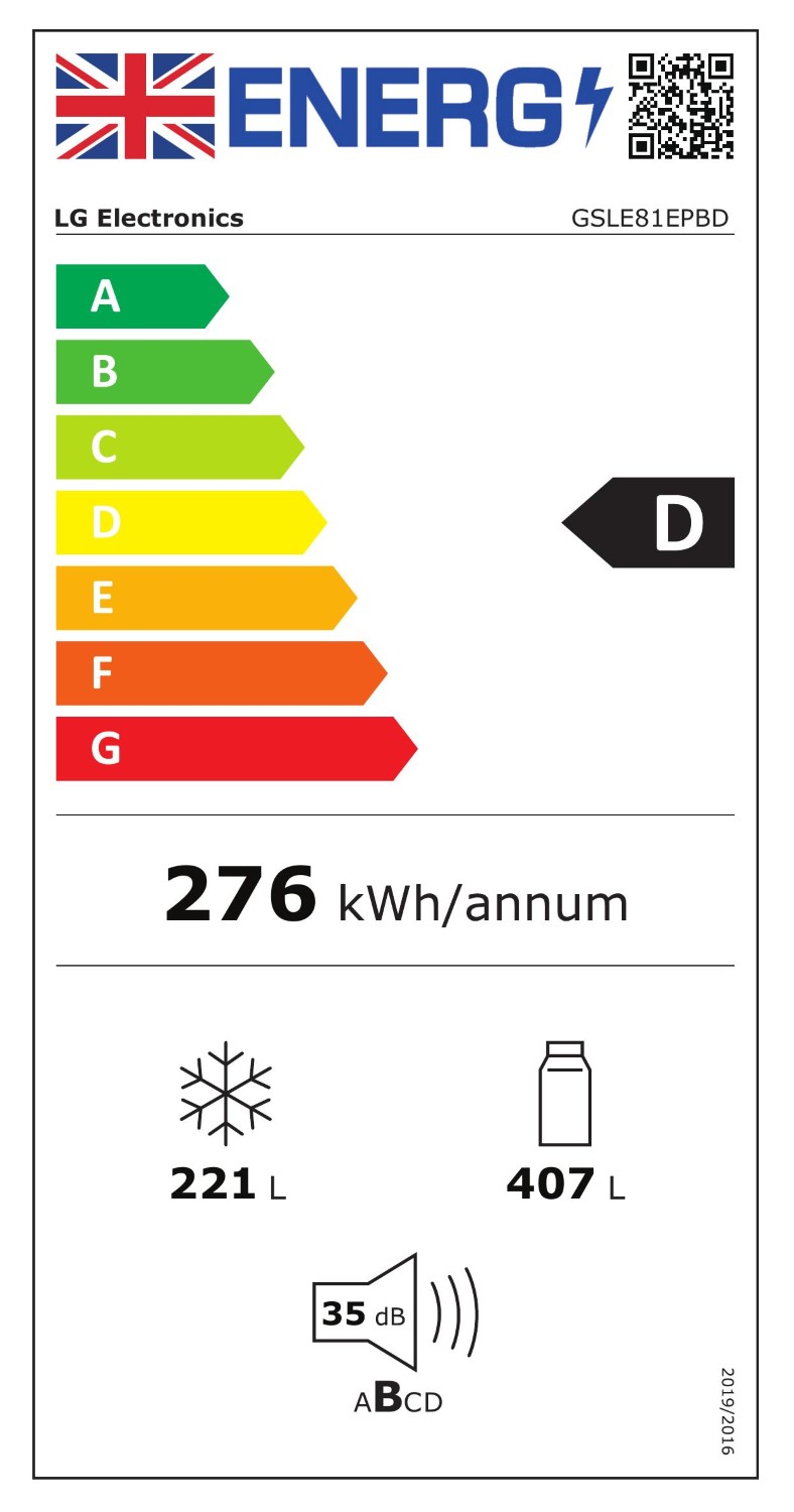 Equipped with a smart inverter compressor, LG's GSLE81EPBD adjusts cooling power according to demand, reducing energy consumption and meeting relevant energy efficiency standards. The fridge freezer is rated with an energy efficiency class of D and operates quietly at a noise level of 35 dB. It also features Smart Connect and WiFi capabilities, allowing you to monitor and control the appliance remotely.