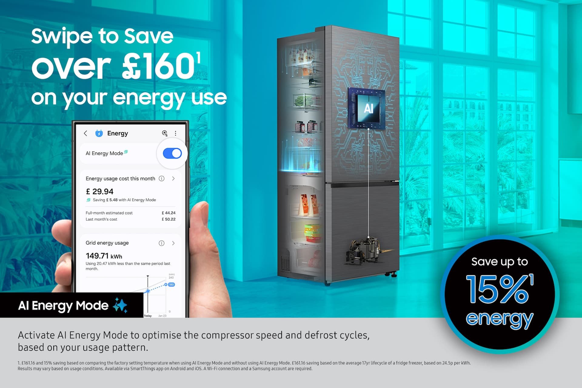 The AI Energy Mode lets you reduce your energy consumption by up to 10% by automatically adjusting compressor speed and defrost cycles based on your habits and surroundings. This intelligent system works alongside SmartThings Energy to provide real time insights and help manage your electricity usage effectively.