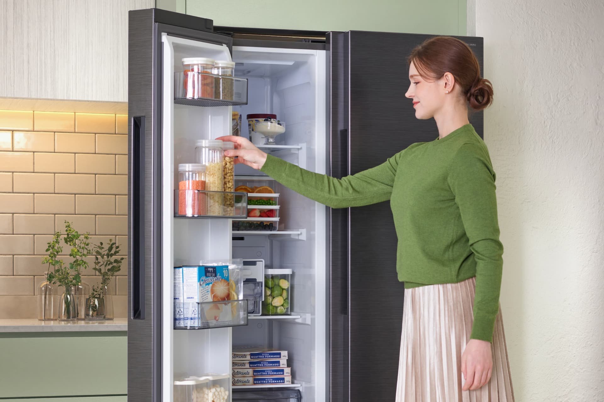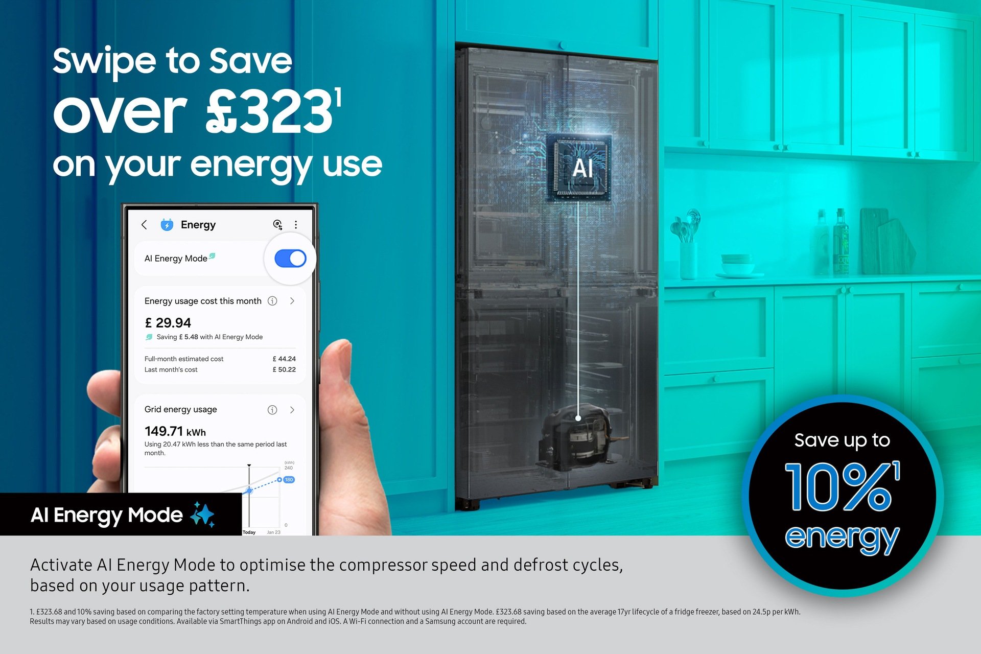 Equipped with AI Energy Mode, this Samsung fridge freezer can reduce energy usage by up to 10%. The intelligent compressor adapts its operation based on your usage patterns and surrounding conditions, optimising performance for energy savings without compromising on freshness. The Digital Inverter Compressor further enhances efficiency, ensuring quieter operation and longer lifespan.