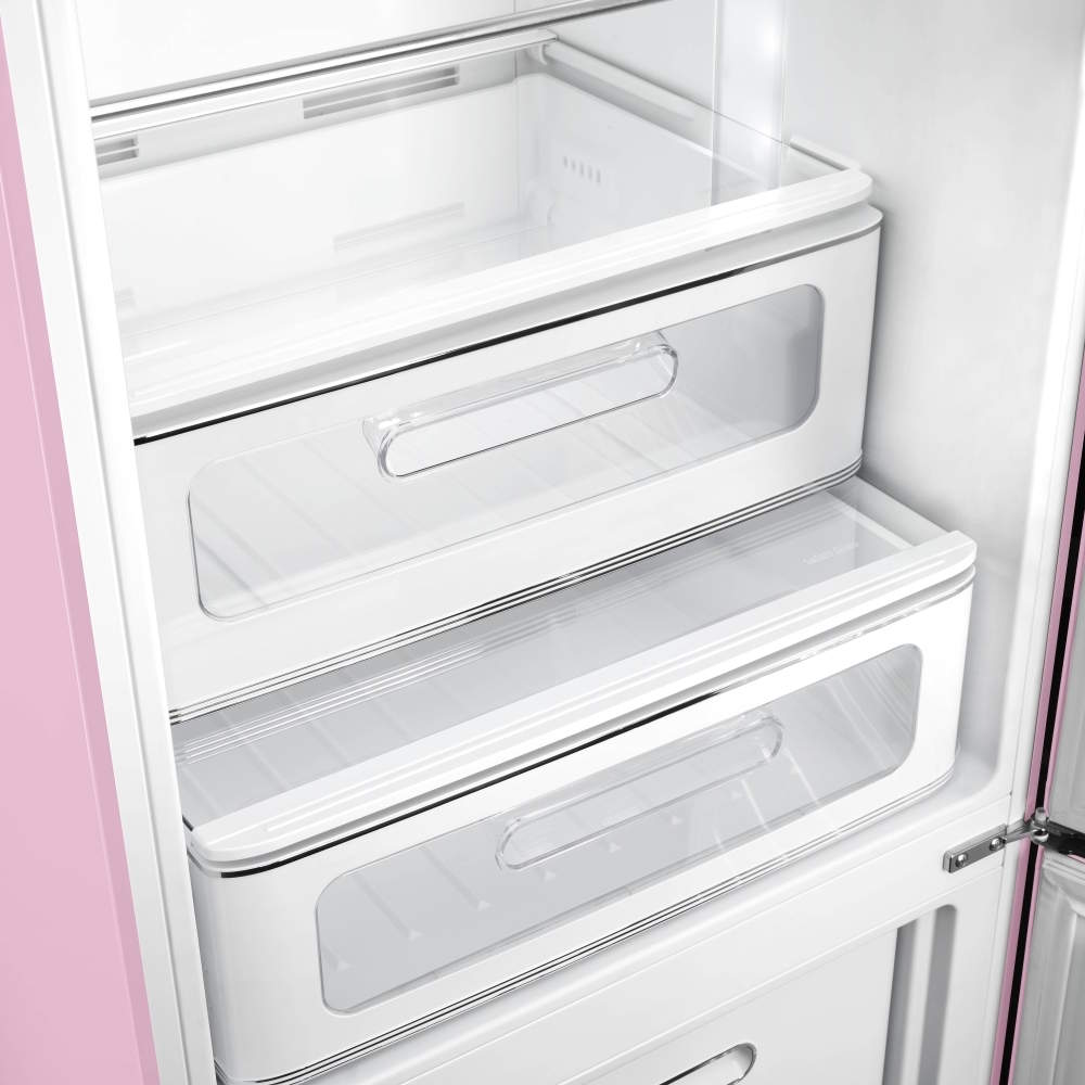 Featuring Smeg’s iconic 1950s styling, the Smeg FAB32RPK5UK fridge freezer brings a touch of personality to your home while maintaining a sophisticated look. Chrome detailing and smooth curves enhance its retro appeal, making it as much a design statement as a kitchen essential.