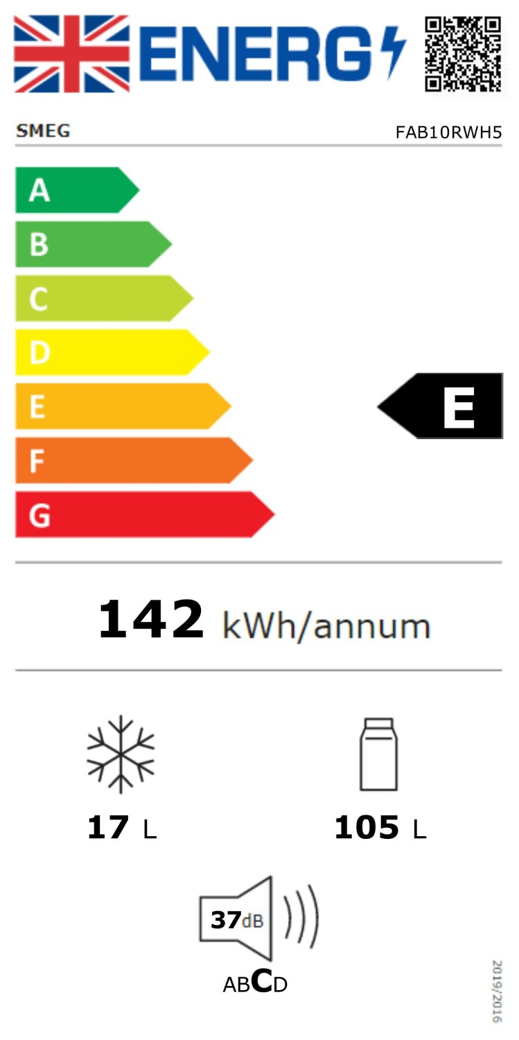 The Smeg FAB10RPB6 fridge uses static cooling technology with automatic defrost for the refrigerator and manual defrost for the freezer. It features an electro-mechanical temperature control and a standard compressor, ensuring efficient cooling performance. With an energy efficiency class of E and an annual energy consumption of 142 kWh, this fridge is designed to be environmentally friendly and cost-effective.