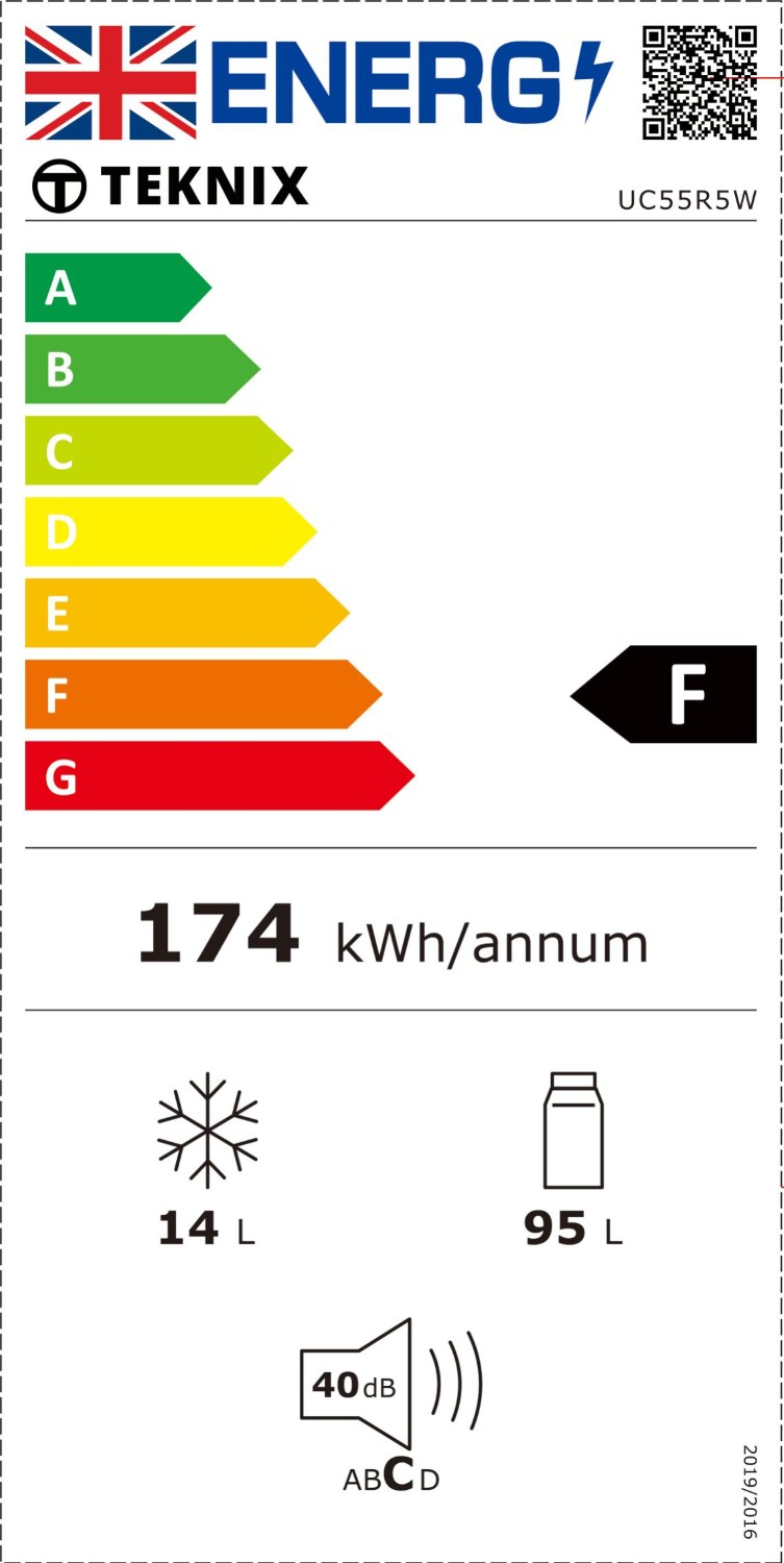 Teknix's UC55R5W is a compact undercounter fridge, perfect for small kitchens or as an additional storage option. With a 109L net capacity, this fridge offers practical storage solutions, and user friendly features, making it a reliable choice for everyday use.