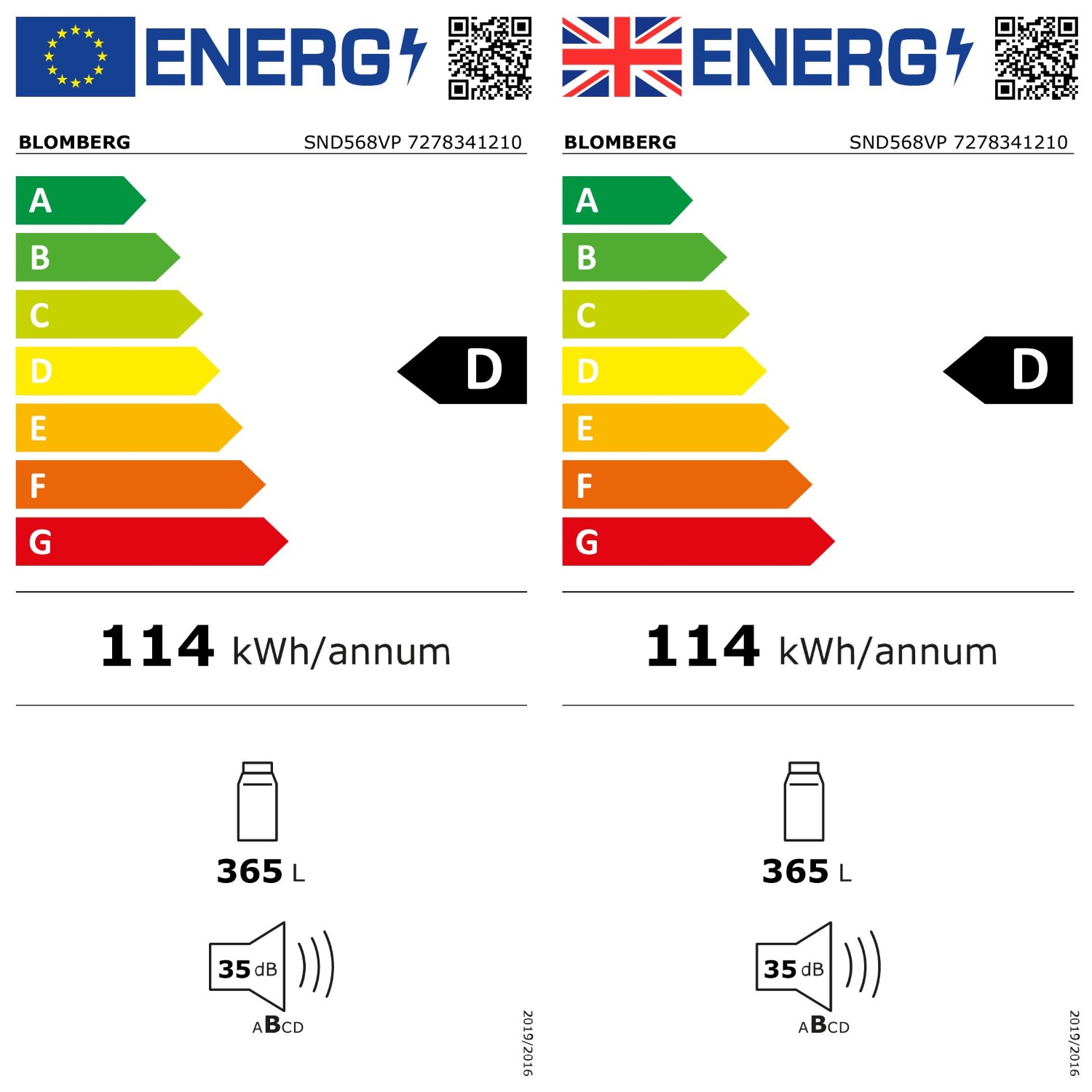 The Blomberg SND568VP is CE-UKCA certified and has an energy efficiency class of D. It operates quietly with a noise level of 35 dB, making it an environmentally friendly and quiet addition to your kitchen.