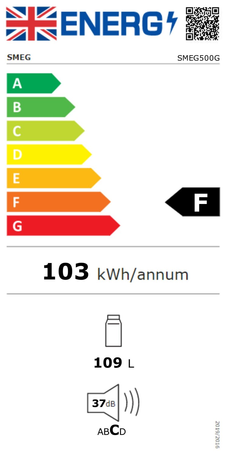The SMEG500G refrigerator is rated with an energy efficiency class F, consuming 103 kWh per year. While the energy rating scale has been re-scaled, this product remains energy efficient, previously rated as A+. It operates quietly with a noise level of 37 dB, ensuring a peaceful environment. The climatic class SN-T makes it suitable for a wide range of room temperatures, from 10°C to 43°C.