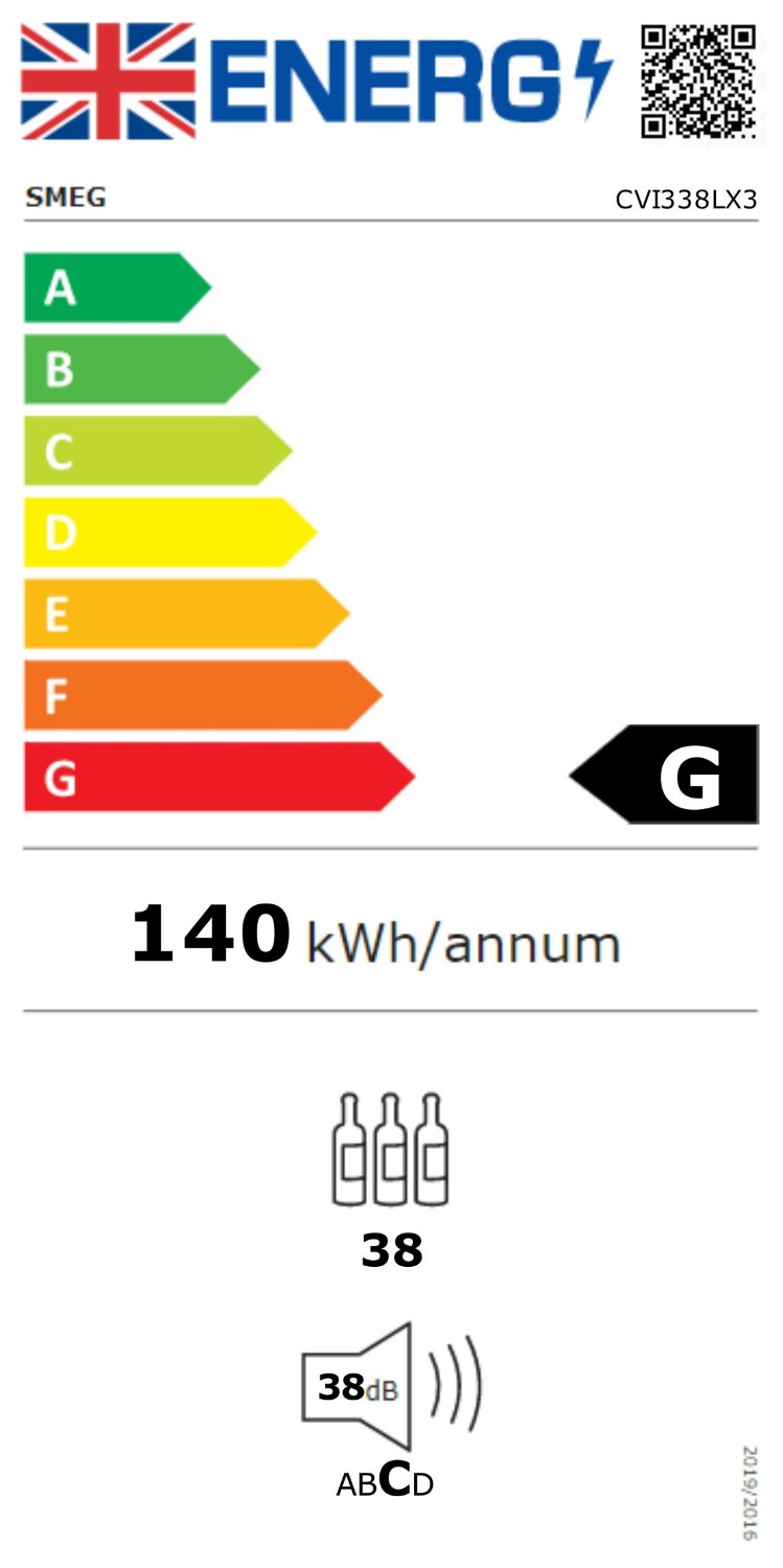Despite the recent re-scaling of energy ratings, this wine cooler remains energy efficient with an annual consumption of 140 kWh. It operates quietly at a noise level of 38 dB, ensuring a peaceful environment in your home. The automatic defrost and fan-assisted cooling system further enhance its performance and ease of use.