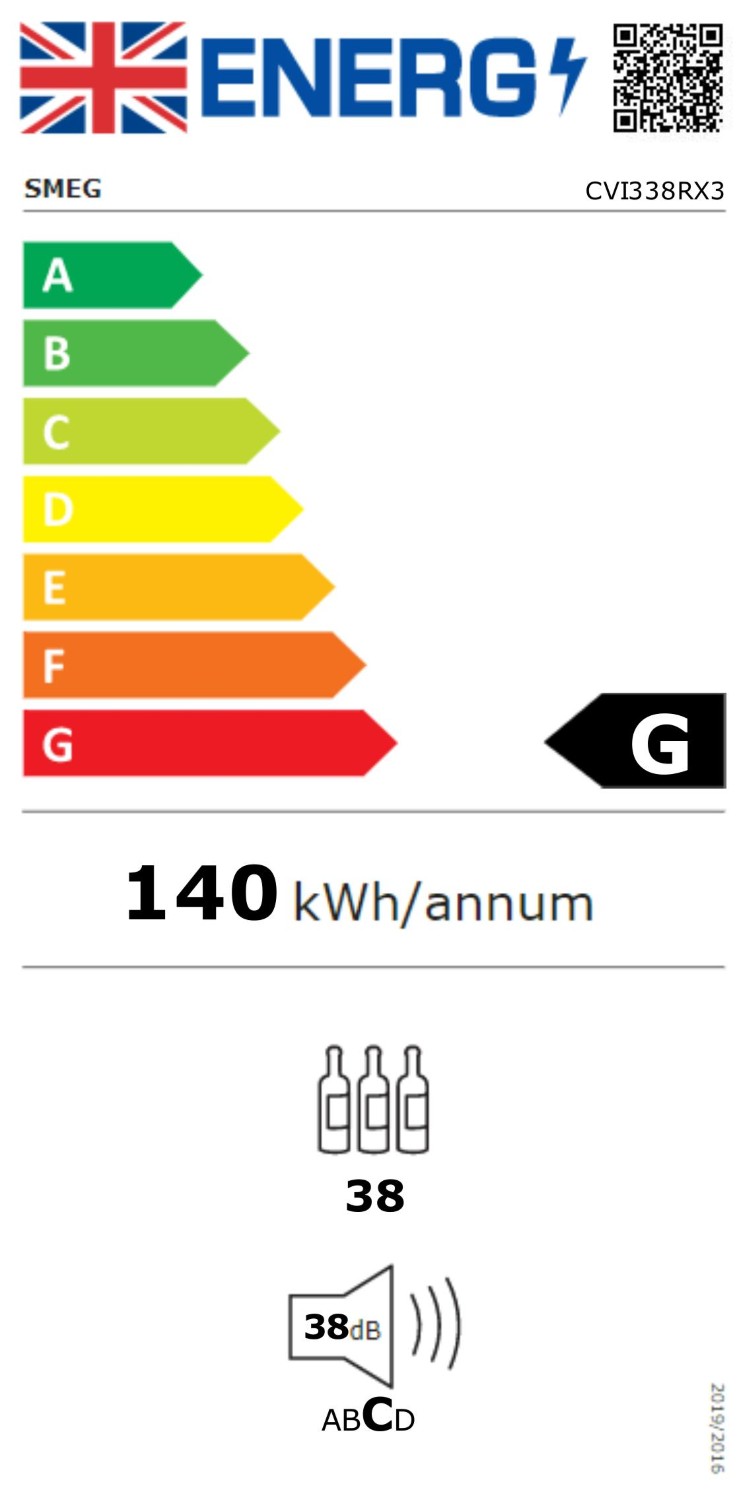 Despite the recent re-scaling of energy ratings, this wine cooler remains energy efficient with an annual consumption of 140 kWh. It operates quietly at a noise level of 38 dB, ensuring a peaceful environment in your home. The automatic defrost and fan-assisted cooling type further enhance its performance and convenience.