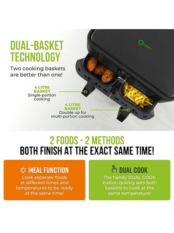 Cook your air fryer family favourites together. Two 4L baskets will cook food independently with individual timers and temperature settings for larger portions or cooking multiple food types at once