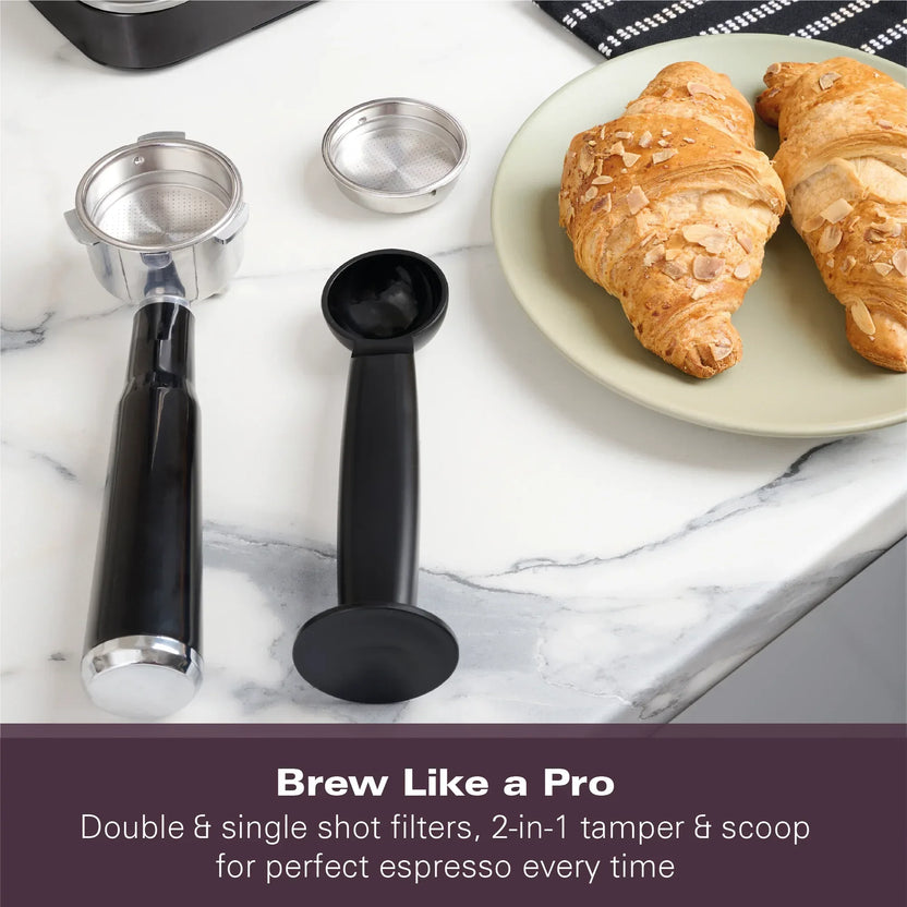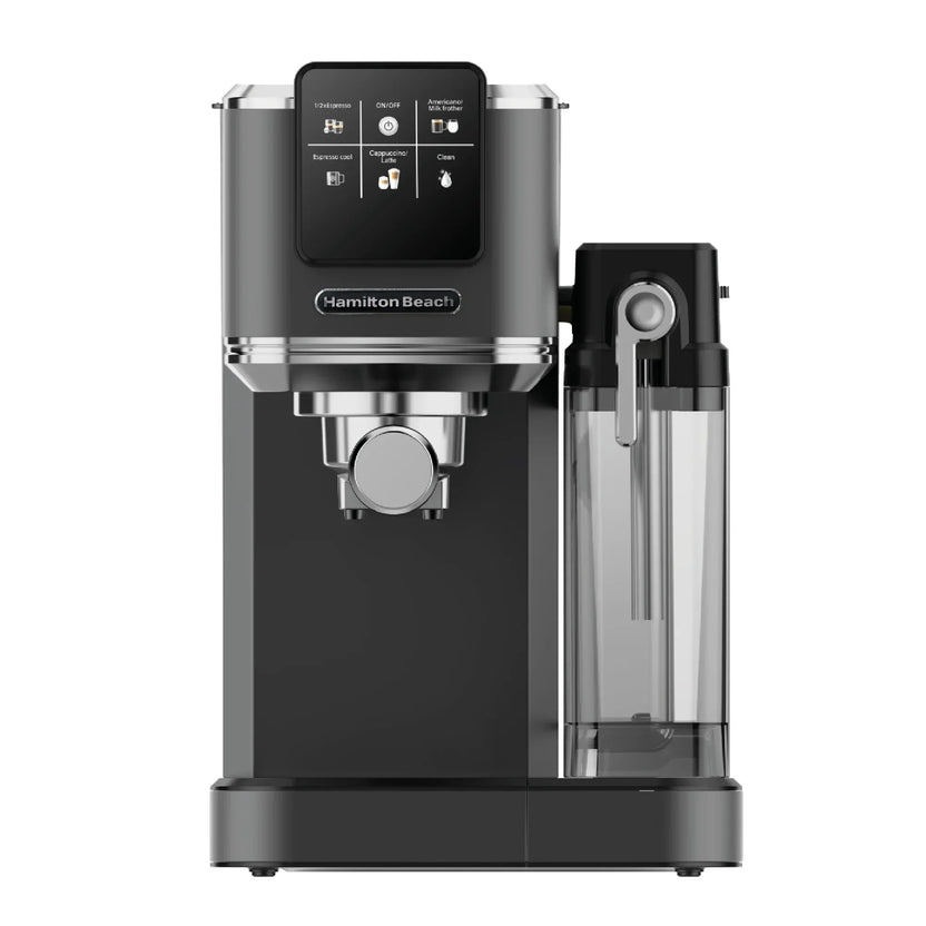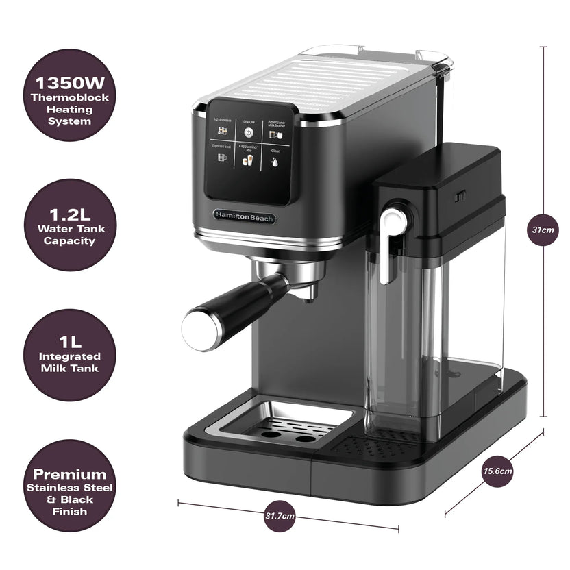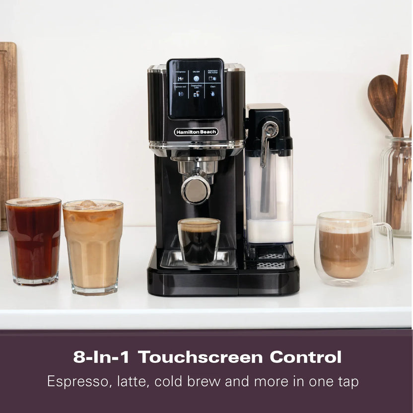 The Hamilton Beach HBC7210B Barista Pro 8 in 1 Black Espresso Machine combines high-quality coffee with an intuitive design. Combining an 8-in-1 touchscreen interface, rapid heating, and a powerful 20-bar pressure system, it delivers a wide range of hot and cold beverages.