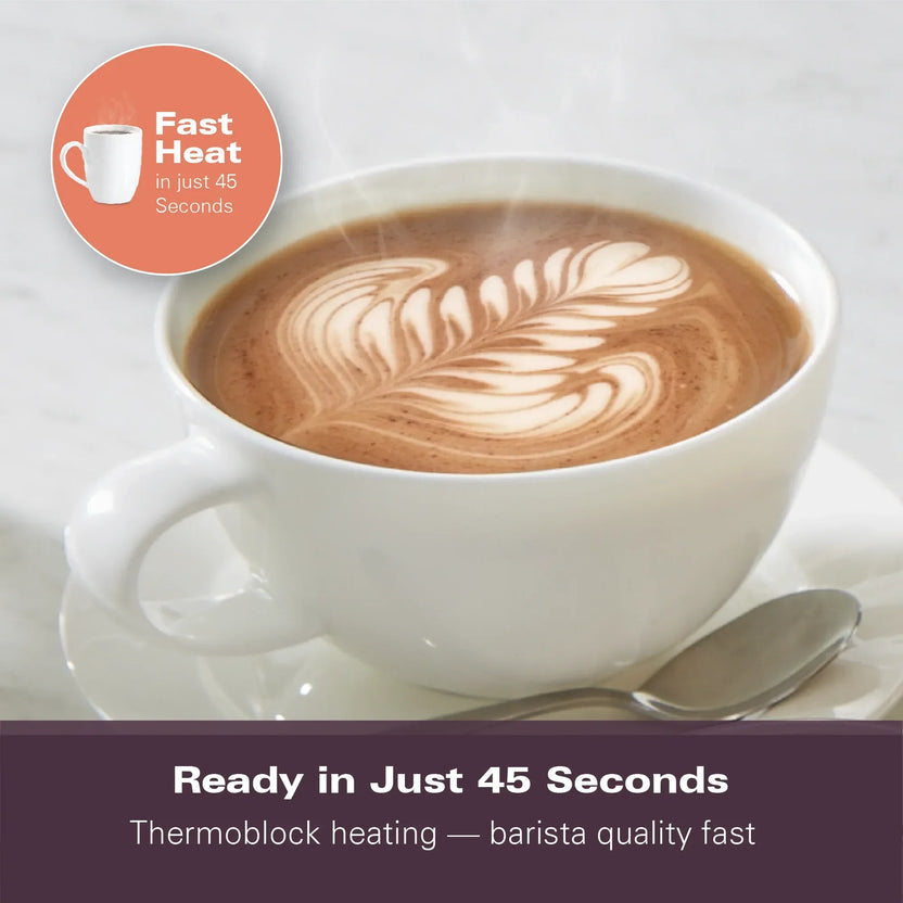 Equipped with a 20-bar pressure system and a fast-heating Thermoblock, the machine reaches optimal temperature in just 45 seconds. This ensures rich extraction and balanced flavour in every sip.