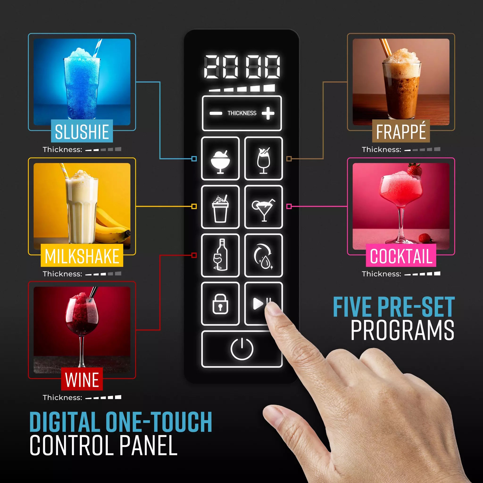 The digital one touch control panel features an easy to read LED display with five drink presets: Slush, Cocktail, Frappe, Milkshake, and Wine. These settings automatically program the machine for your convenience, while manual controls let you adjust the thickness to suit your preferences.