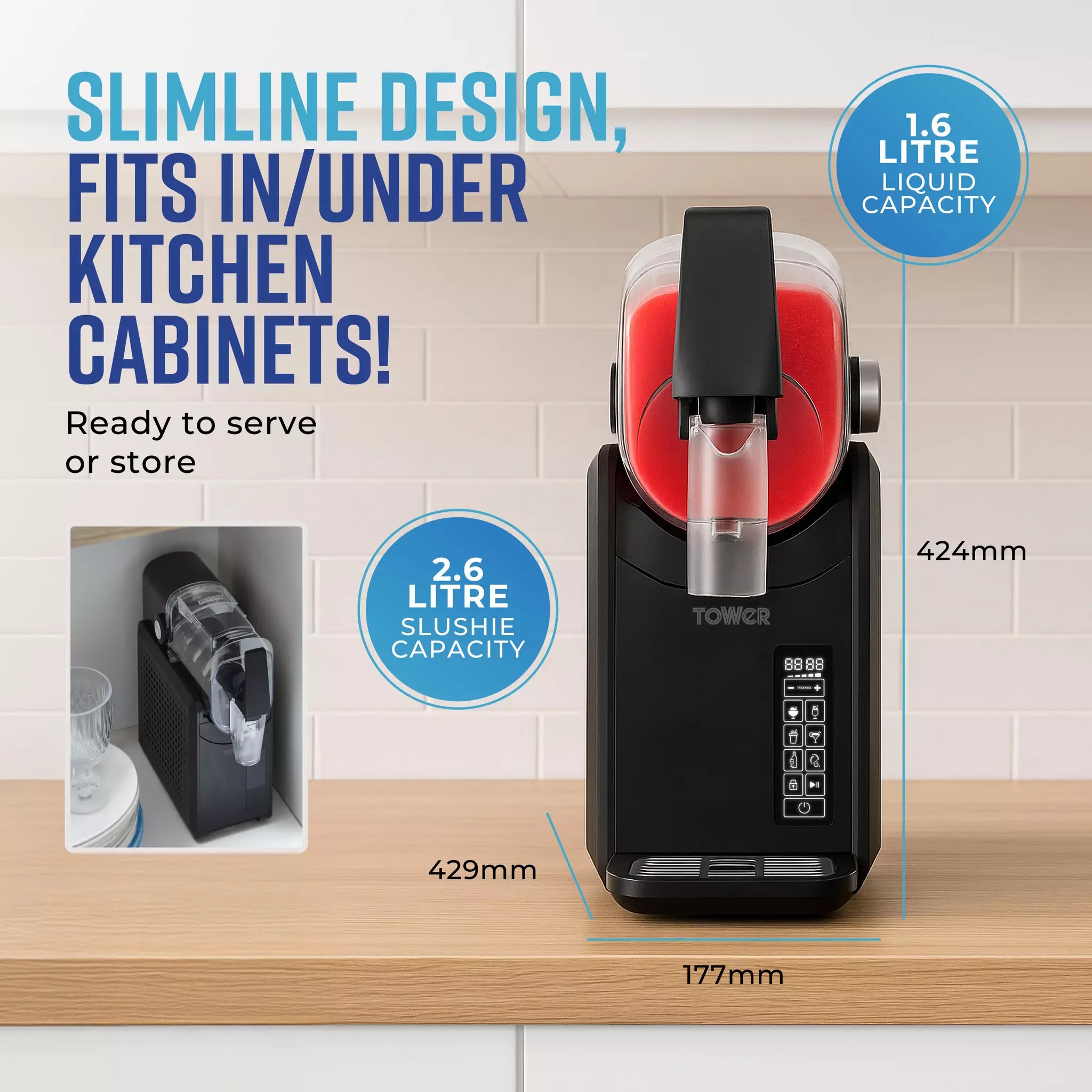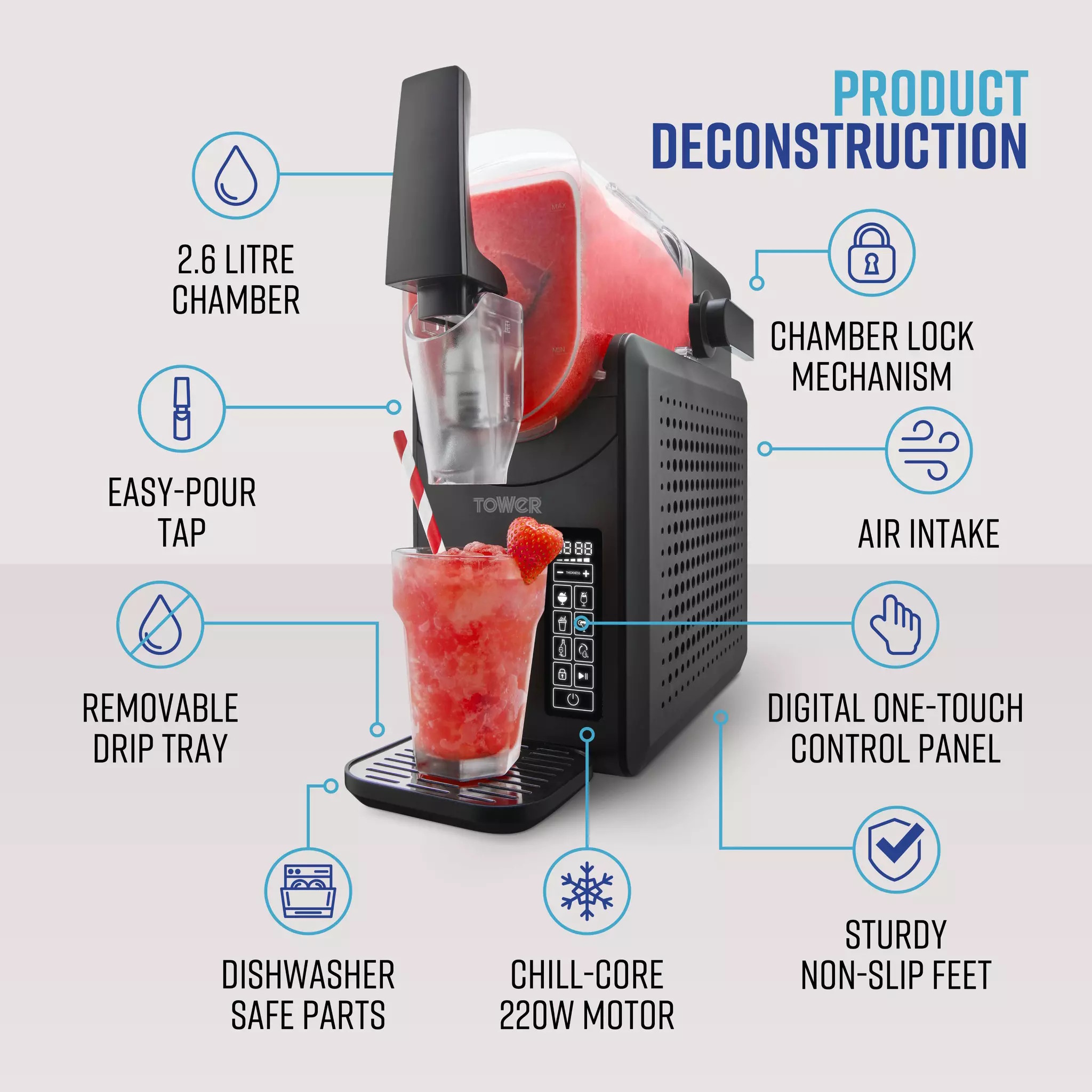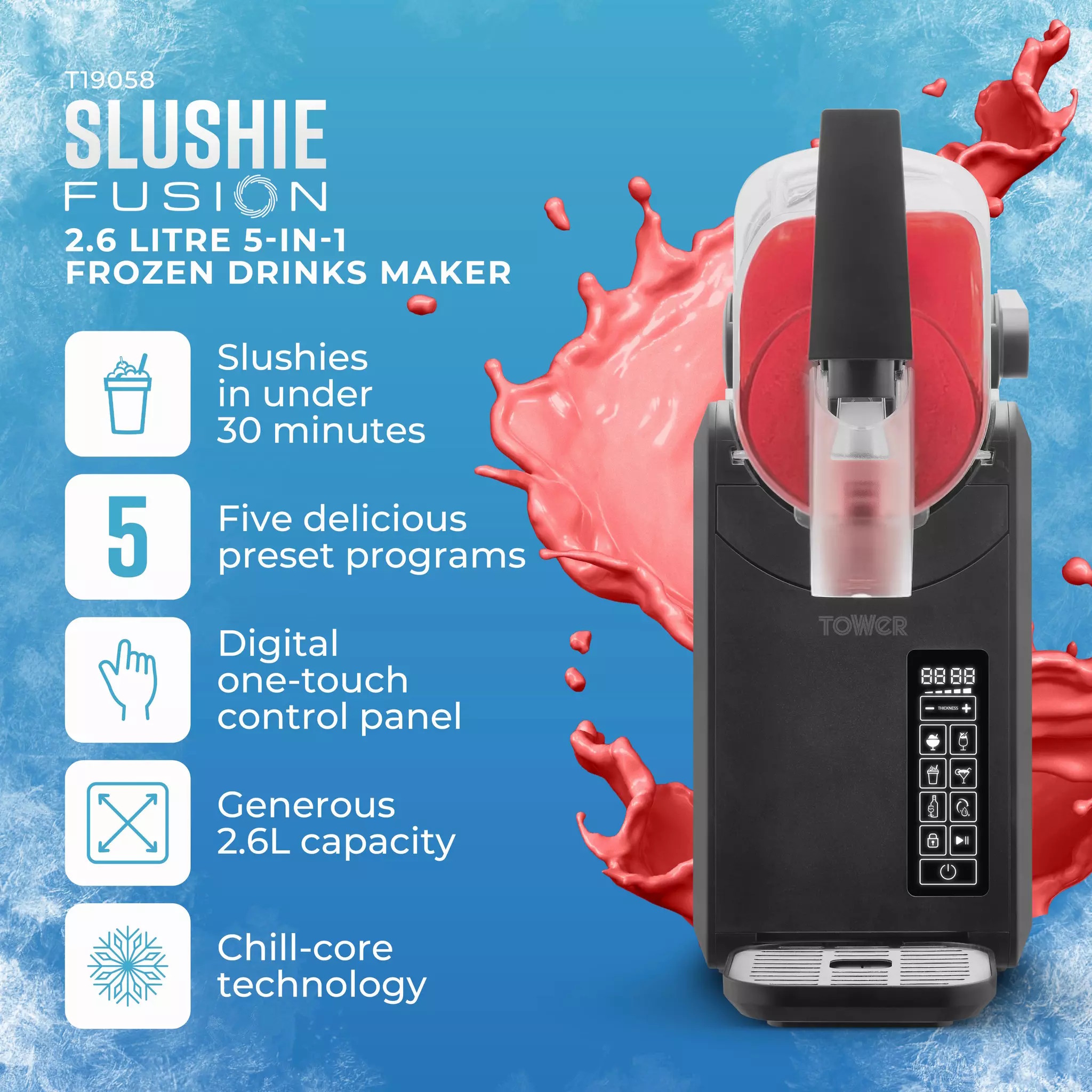 Tower's T19058 Slushie Fusion 5 in 1 frozen drinks maker creates a variety of frozen beverages in under 30 minutes. With its extremely user friendly digital controls, innovative freezing technology, and generous capacity, this machine is perfect for parties, family gatherings, or any occasion where ice cold refreshing drinks are desired.