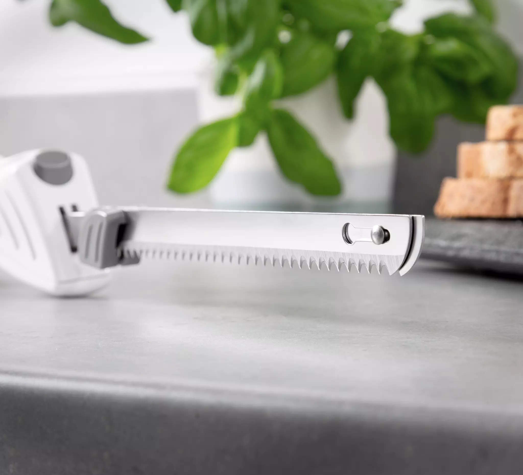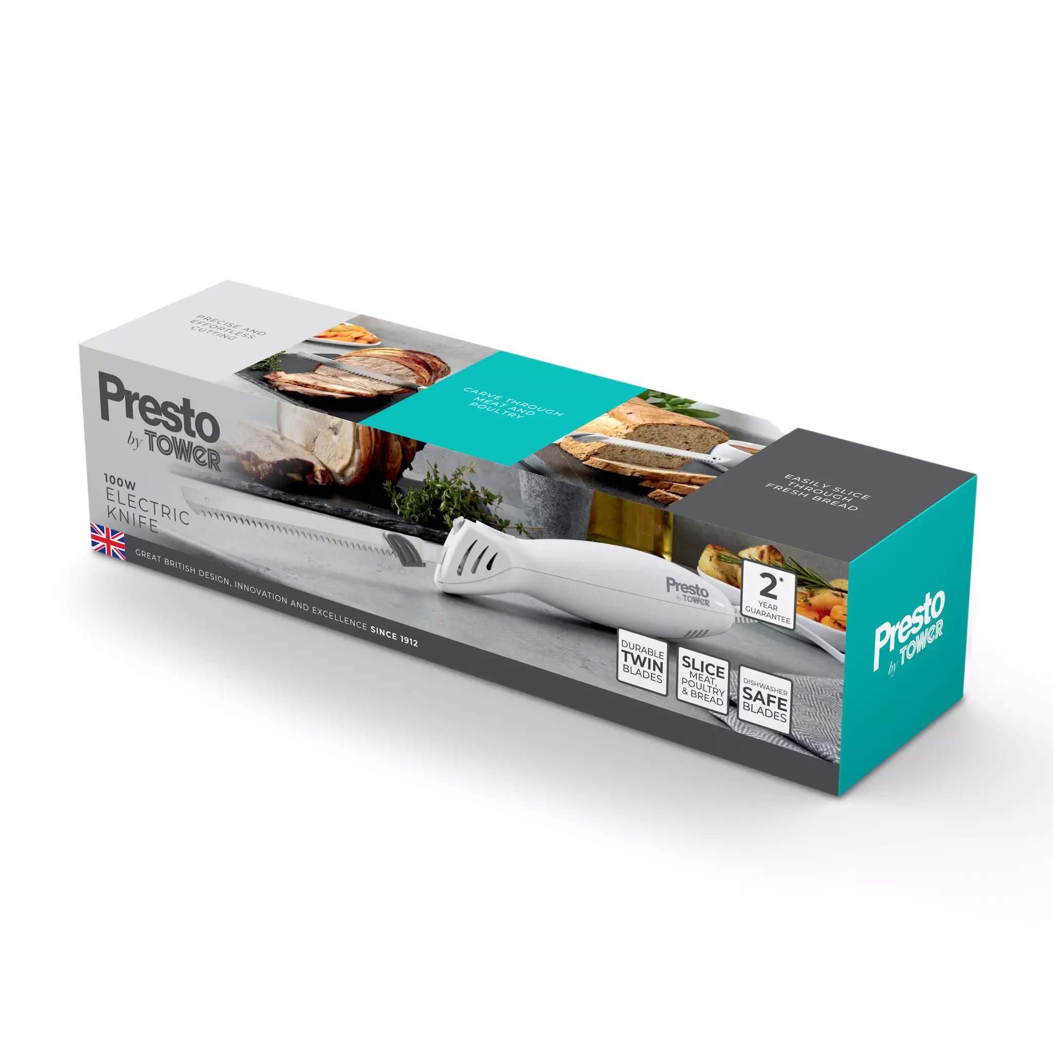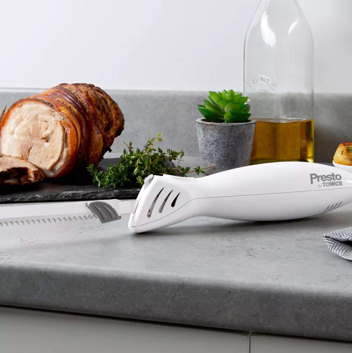 The Tower PT19027WHT Presto Electric Knife makes carving effortless and precise. Powered by a 100W motor and equipped with durable dual stainless steel blades, it’s designed to handle everything from roast meats to crusty bread. Quiet operation and a comfortable grip make it a reliable addition to any kitchen.