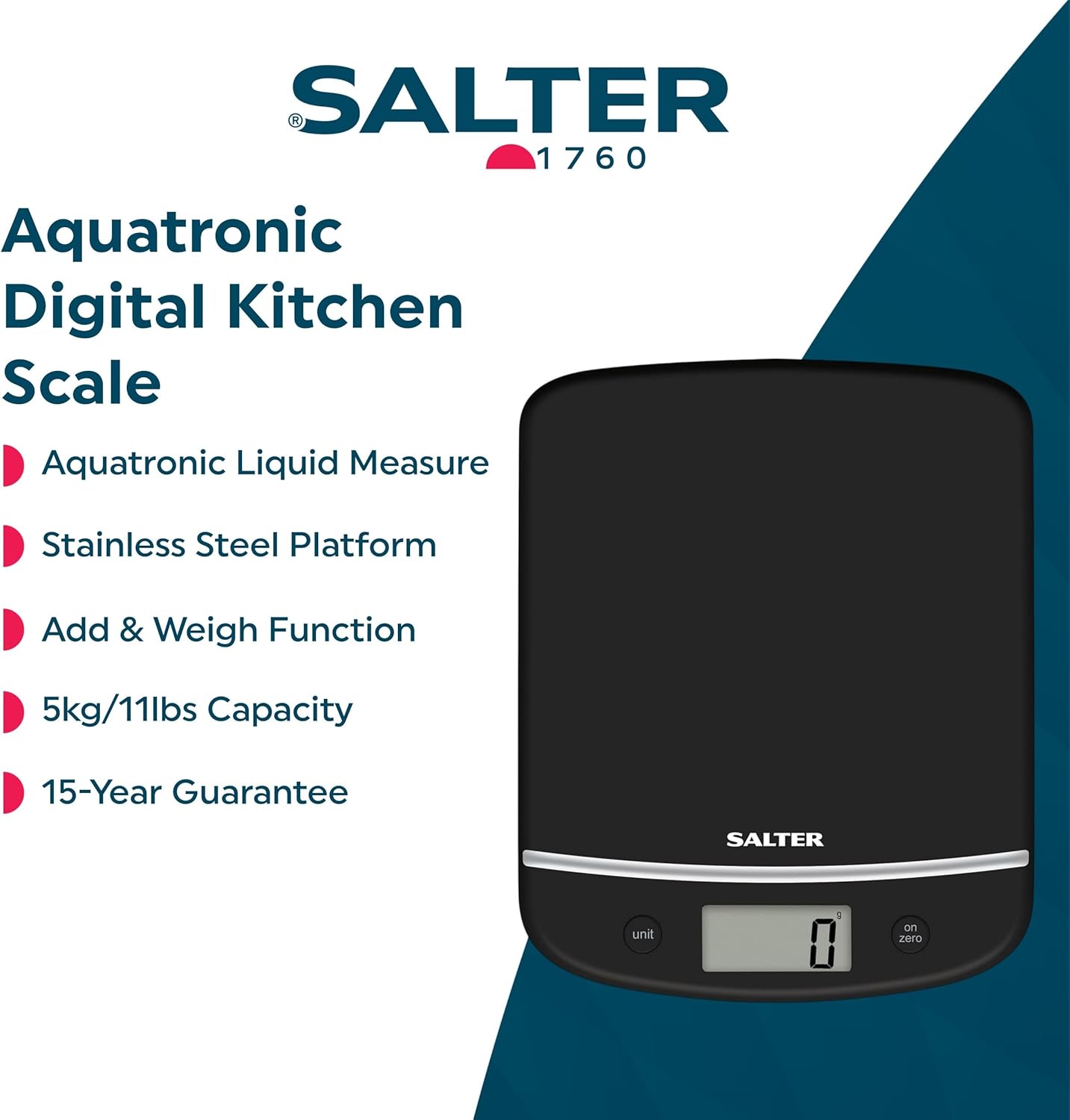 - Aquatronic Function: Measures liquids (ml or fl. oz) and dry ingredients (g or lb oz).