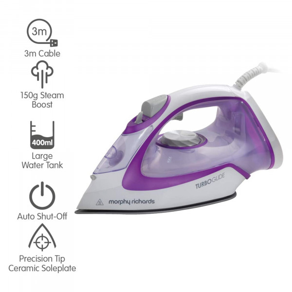 The Morphy Richards Turbo Glide steam iron quickly and easily removes creases from all fabrics and comes with an extra-long 3m cable for easy reach.