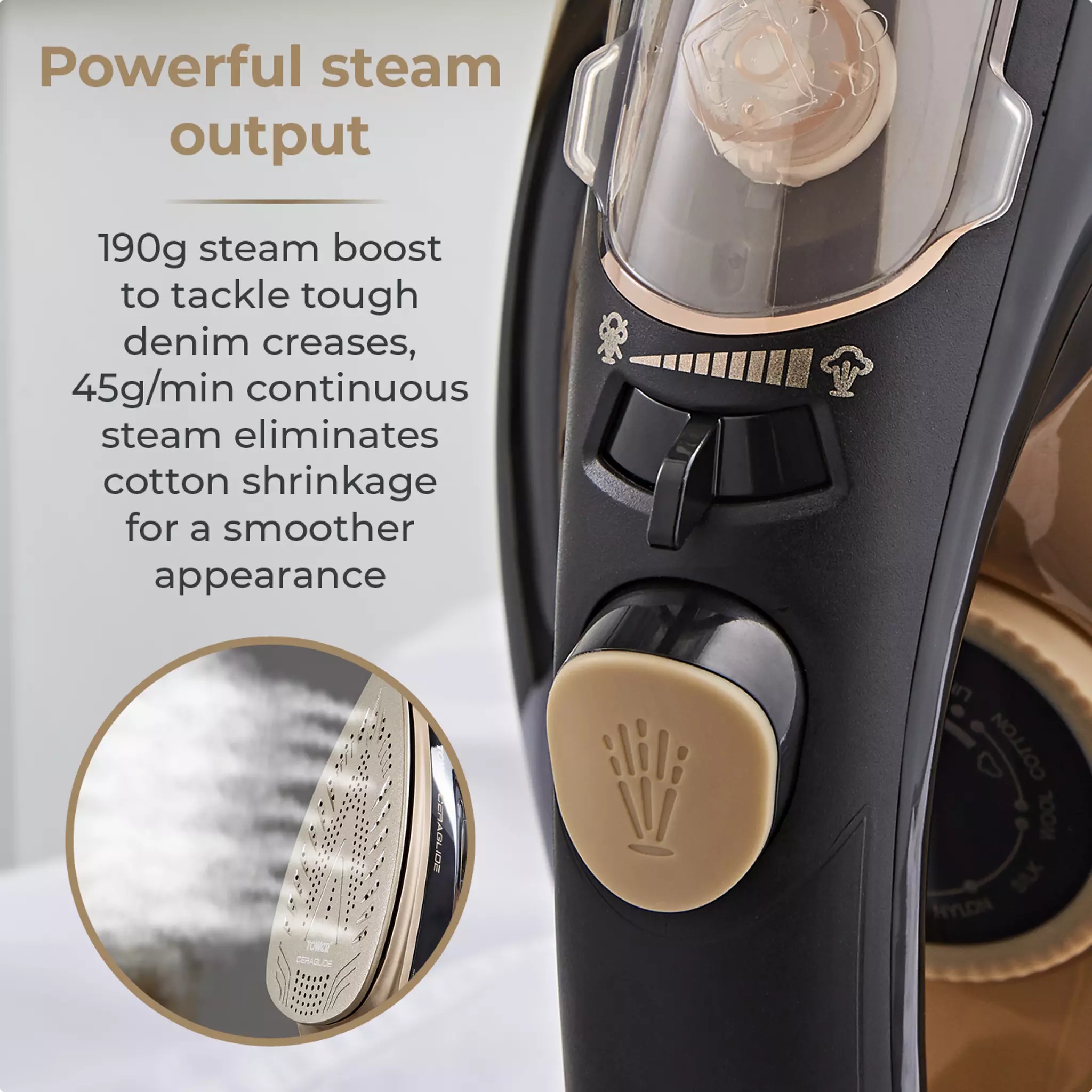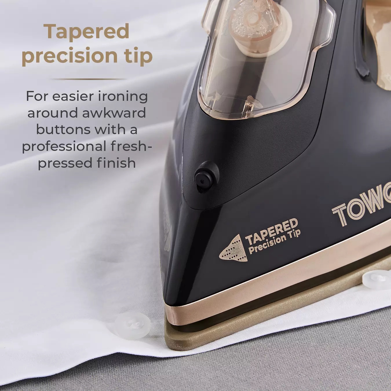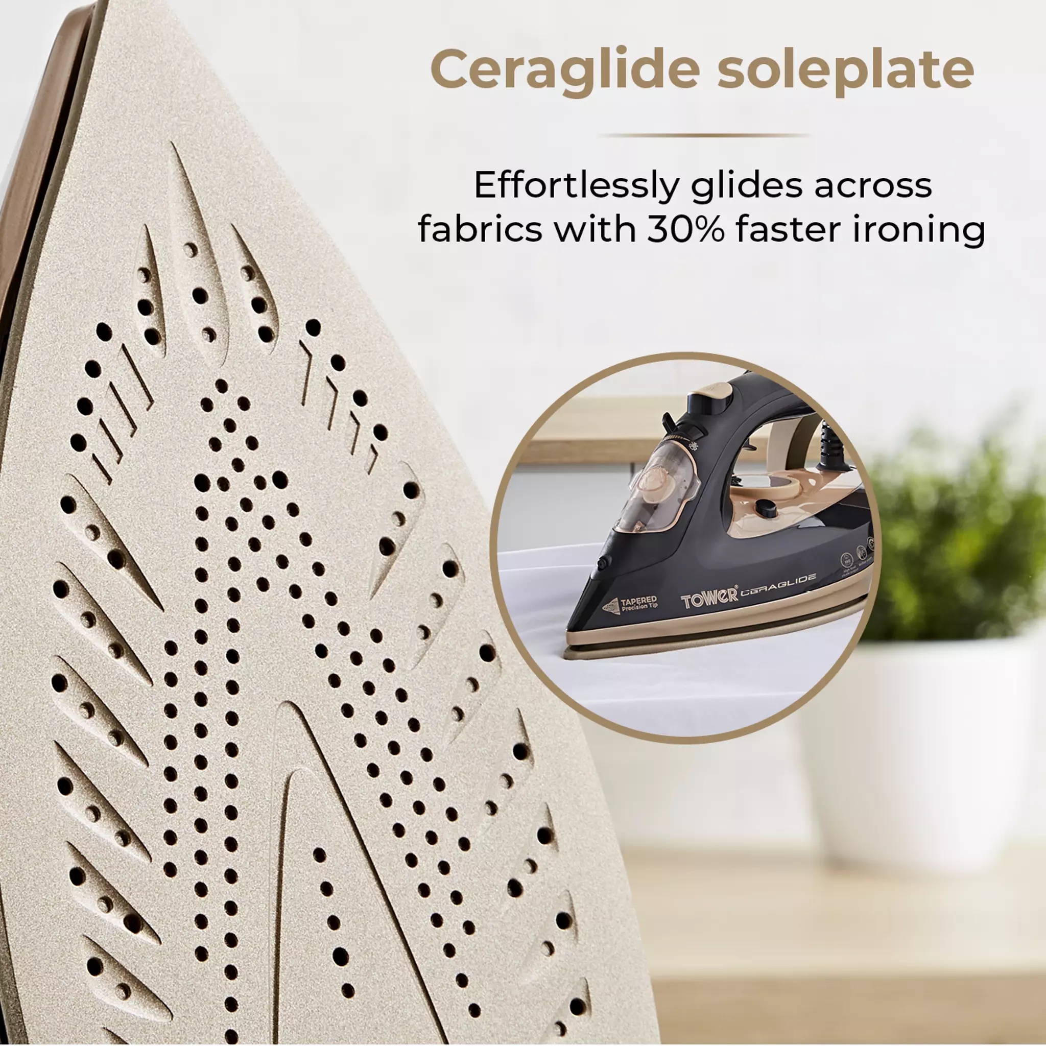 The Tower T22021GLD Ceraglide 3100W Rose Gold Steam Iron combines powerful performance with elegant design to make ironing faster, easier and more effective. Finished in a stylish black and rose gold, this high-powered steam iron features advanced steam output, a smooth ceramic soleplate, and convenient functions that enhance both efficiency and fabric care.