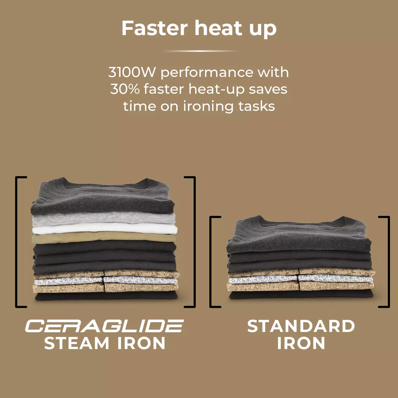 With a 3100W power output, this steam iron heats up 20% faster than standard models, helping you get through your ironing tasks in less time. The 3m power cord offers extended reach and flexibility, while vertical steam options are ideal for curtains and hanging garments.