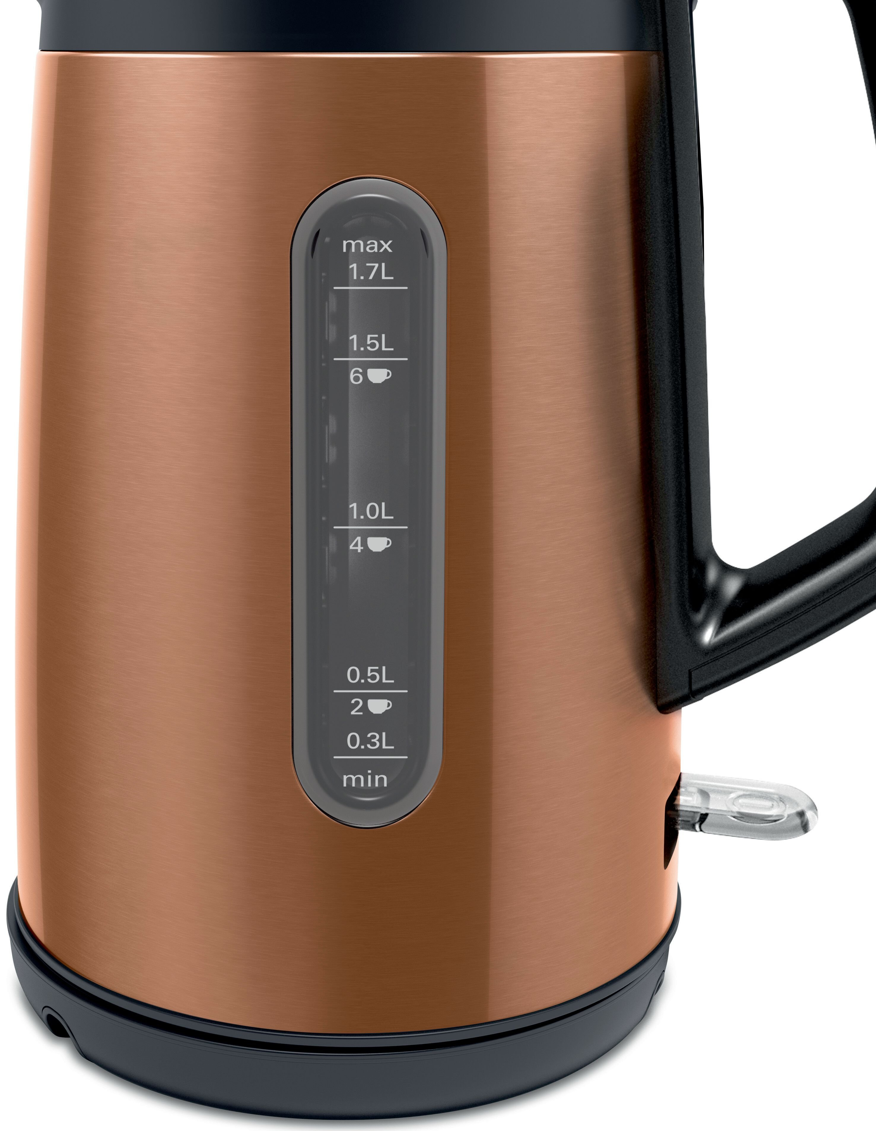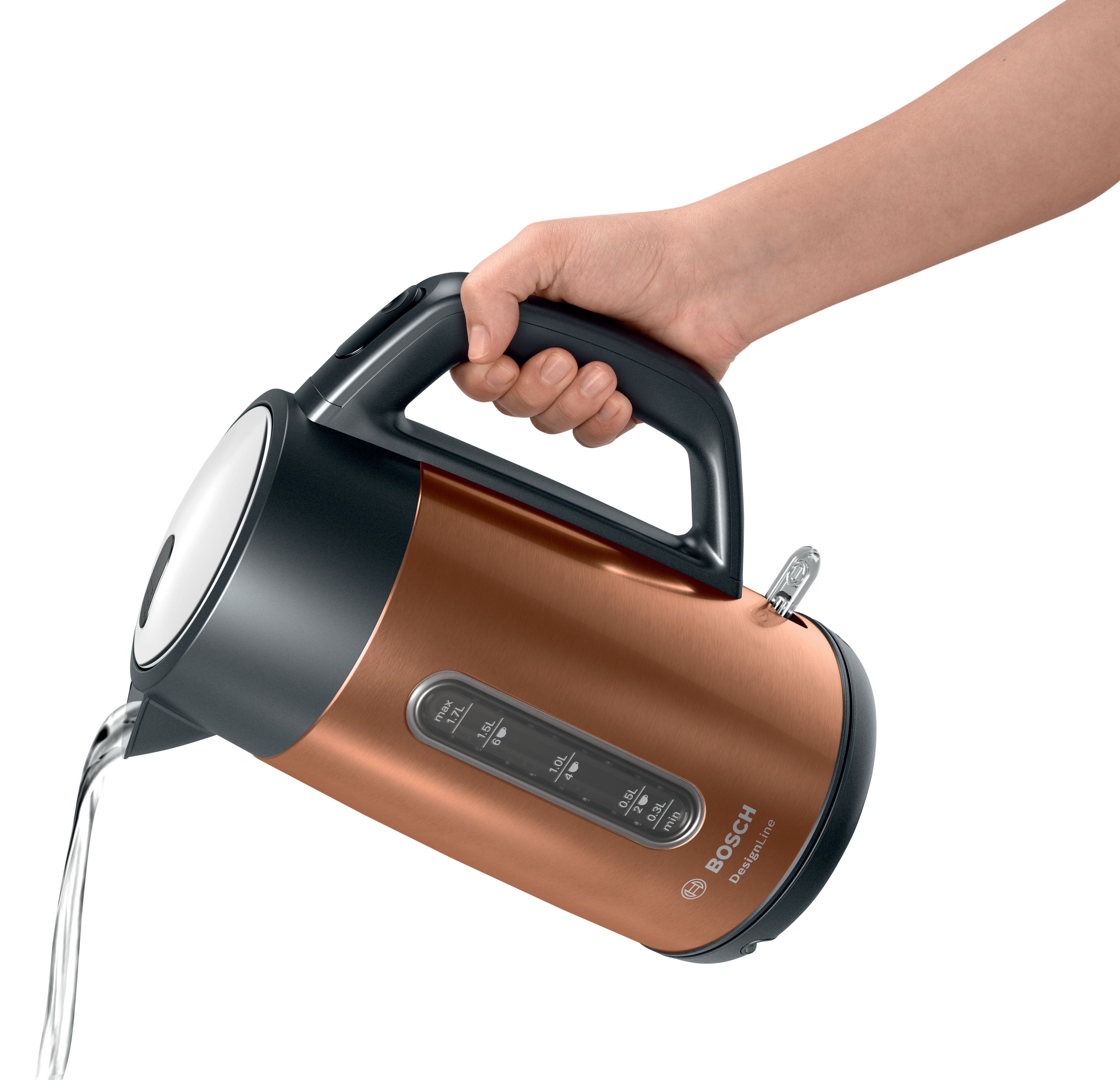 The Bosch TWK4P439GB designline 1.7L jug kettle combines stylish copper design with efficient performance and dependable safety features. This kettle is a practical and elegant choice for any kitchen.