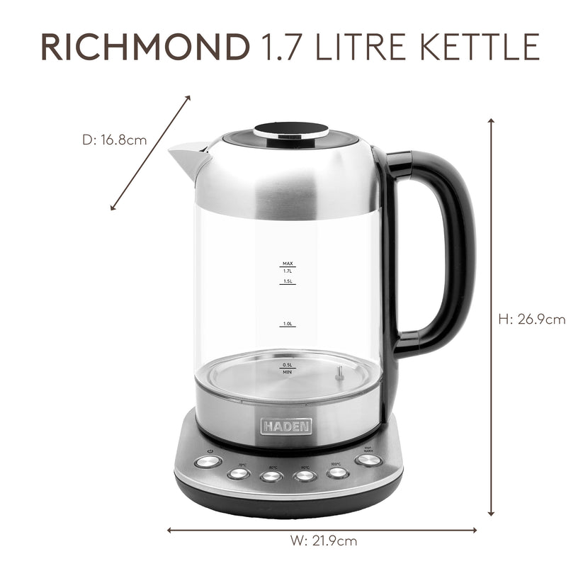 The Haden 197207 Richmond 1.7L Stainless Steel Kettle features a mesmerising illuminated base, adding a touch of charm to your kitchen while boiling water quickly and efficiently.