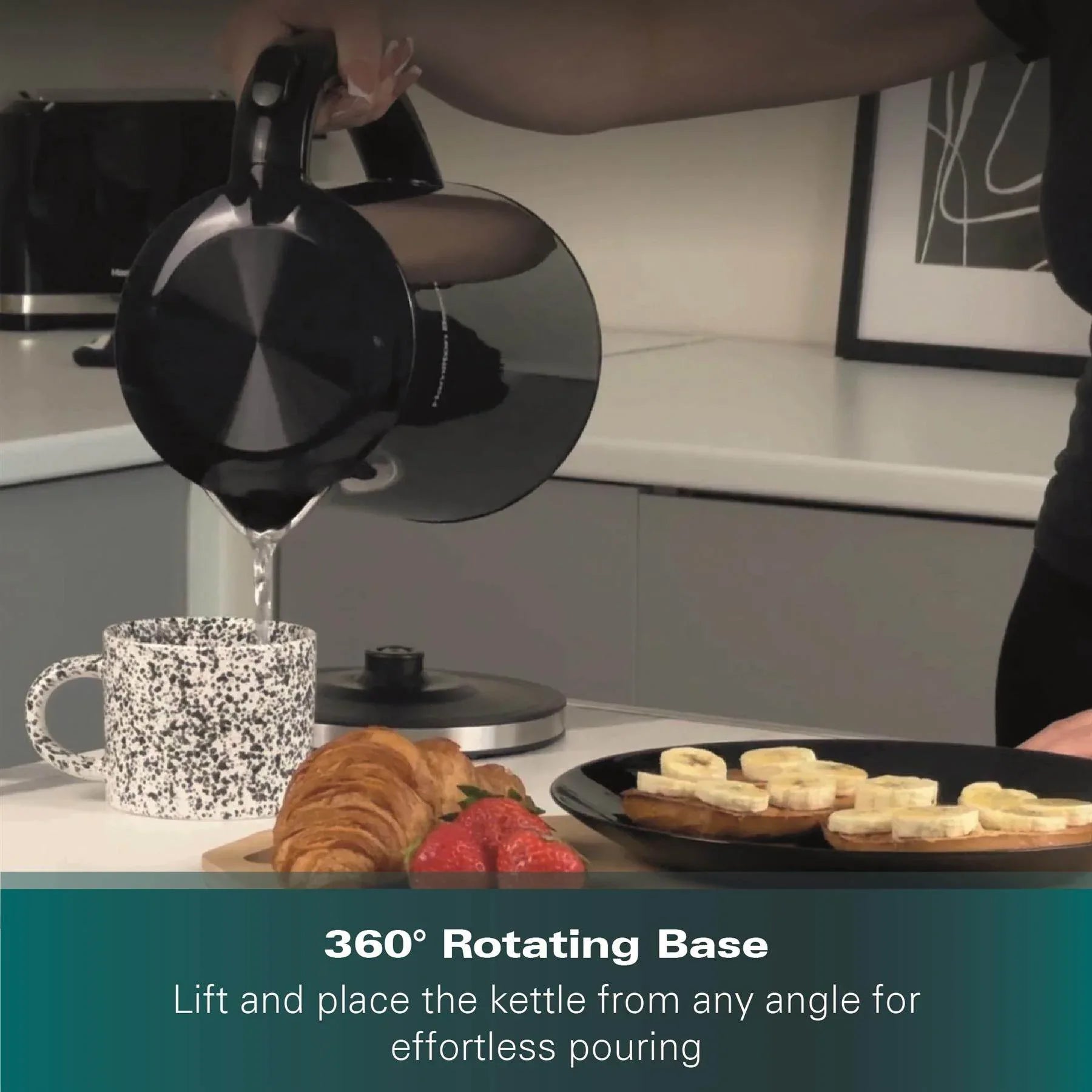 Designed with convenience in mind, the kettle features a 360° rotational base, a push-release lid for easy filling, and integrated cord storage for a tidy finish. Boil dry protection provides added reassurance by automatically switching off the kettle when empty.