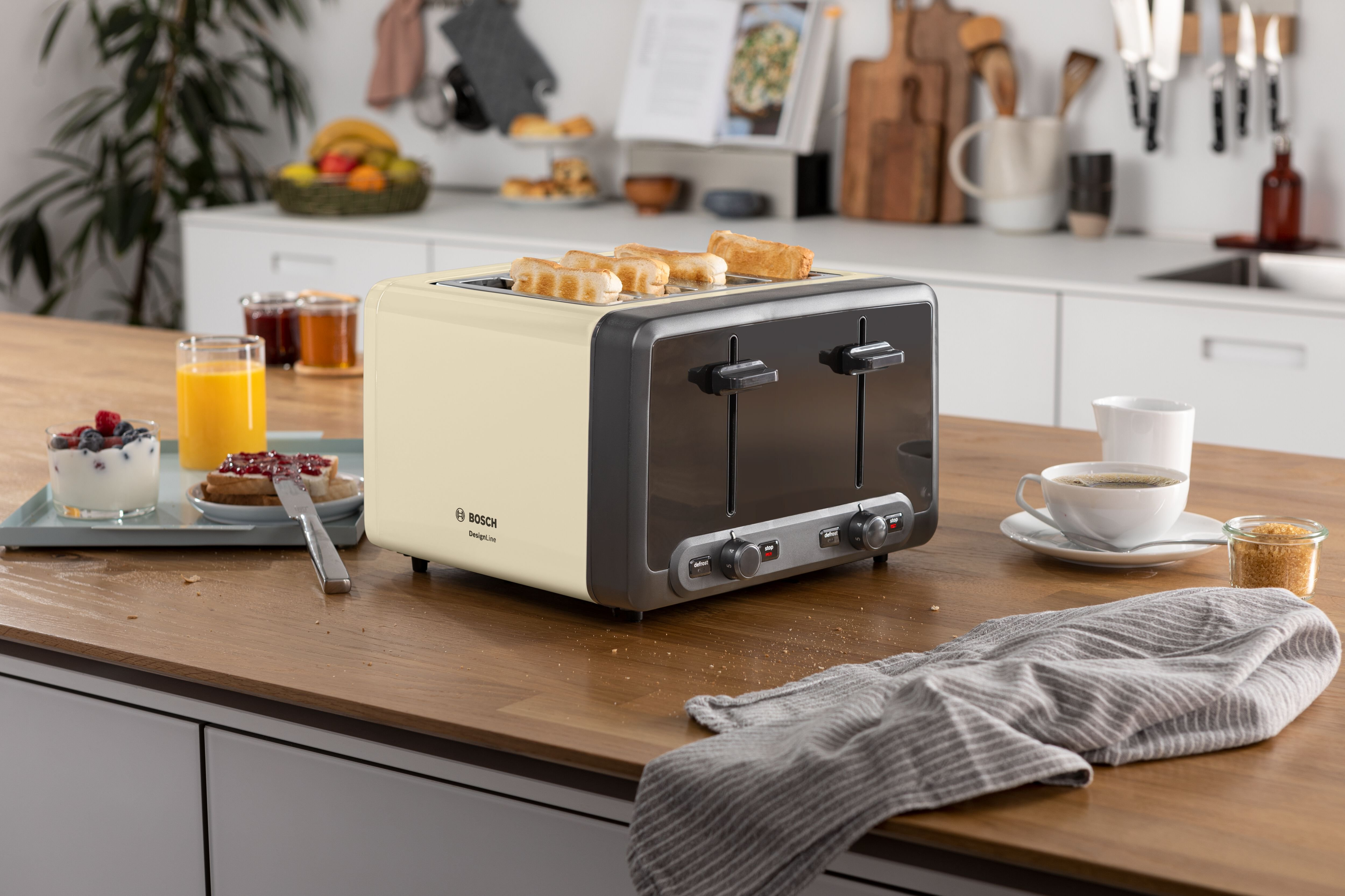 The Bosch TAT4P447GB 4 slice cream toaster blends style, convenience and smart features to make breakfast easier for the whole family. With wide slots, even browning and simple controls, this cream toaster is the perfect fit for busy mornings and stylish kitchens alike.