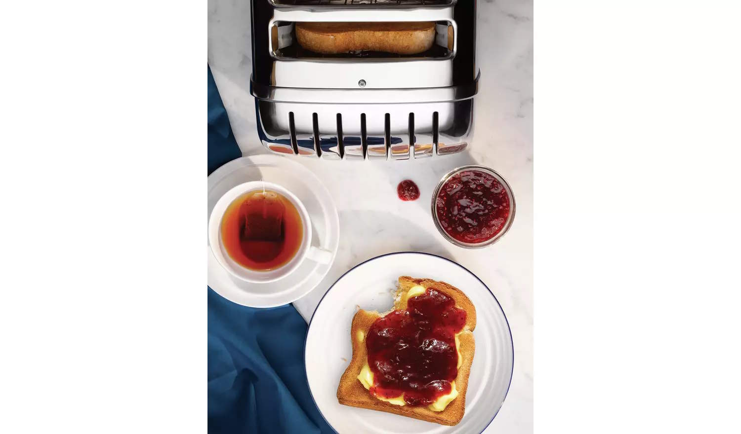 The toaster features extra-wide slots, suitable for thick slices, bagels, or teacakes, and offers independent controls for each pair of slots. The high-lift mechanism enables easy removal of smaller items, while the 'lift and look' function allows users to check toasting progress without cancelling the cycle. Additional defrost and reheat functions enhance usability.