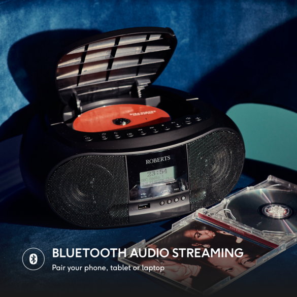 The Roberts Zoombox 4 CD & DAB+ portable black boombox offers a comprehensive and flexible audio solution, combining traditional CD playback with modern digital features. Designed for ease of use and versatility, it delivers high-quality sound across a range of listening formats making it ideal for both home and portable use.