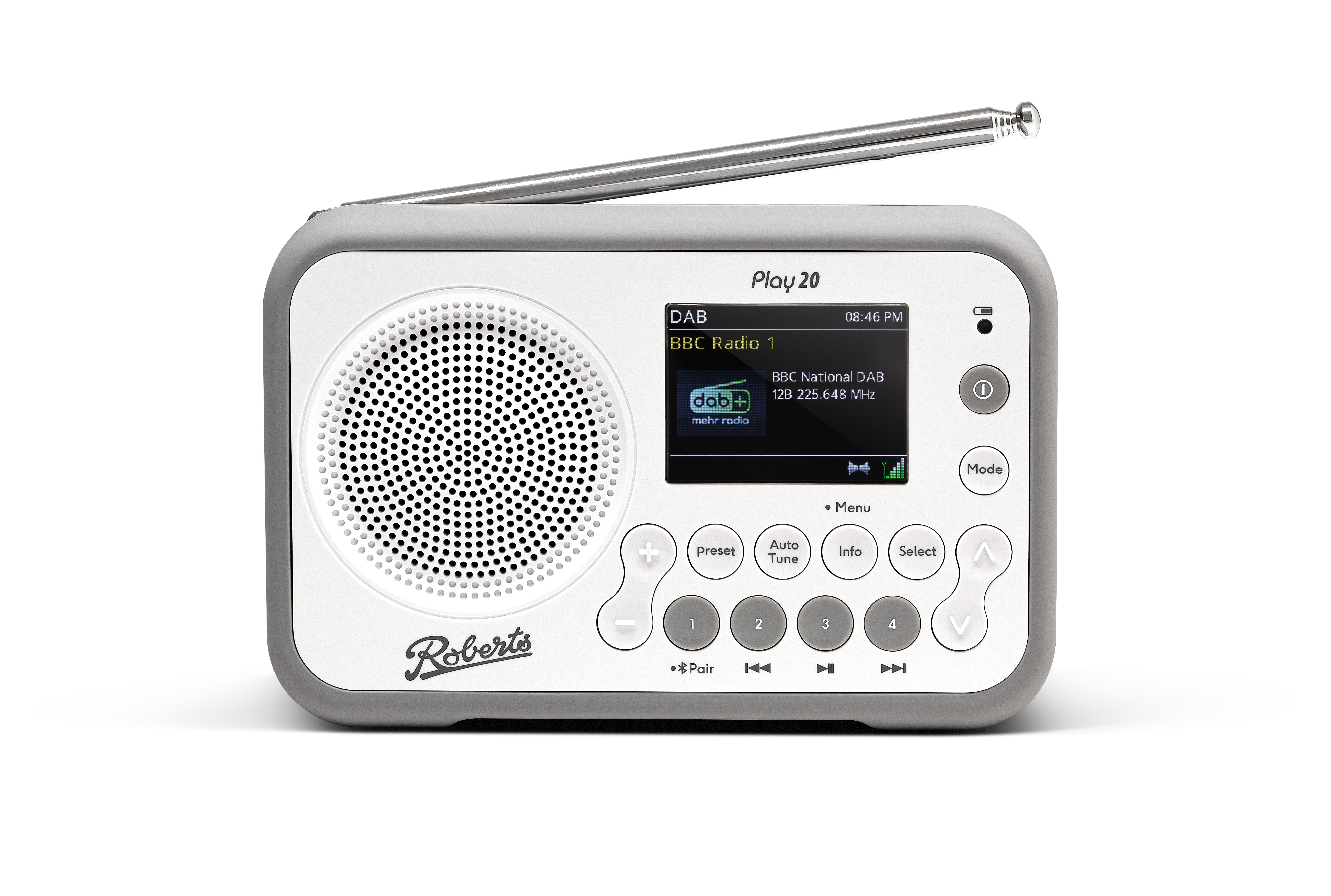 The Roberts Play 20 white portable DAB radio with bluetooth offers a compact and durable design, ideal for versatile listening at home or on the move. With access to DAB, DAB+, and FM radio, along with Bluetooth connectivity, it delivers a wide range of listening options in a portable format. Its built-in rechargeable battery and user-friendly features make it a practical choice for everyday use.