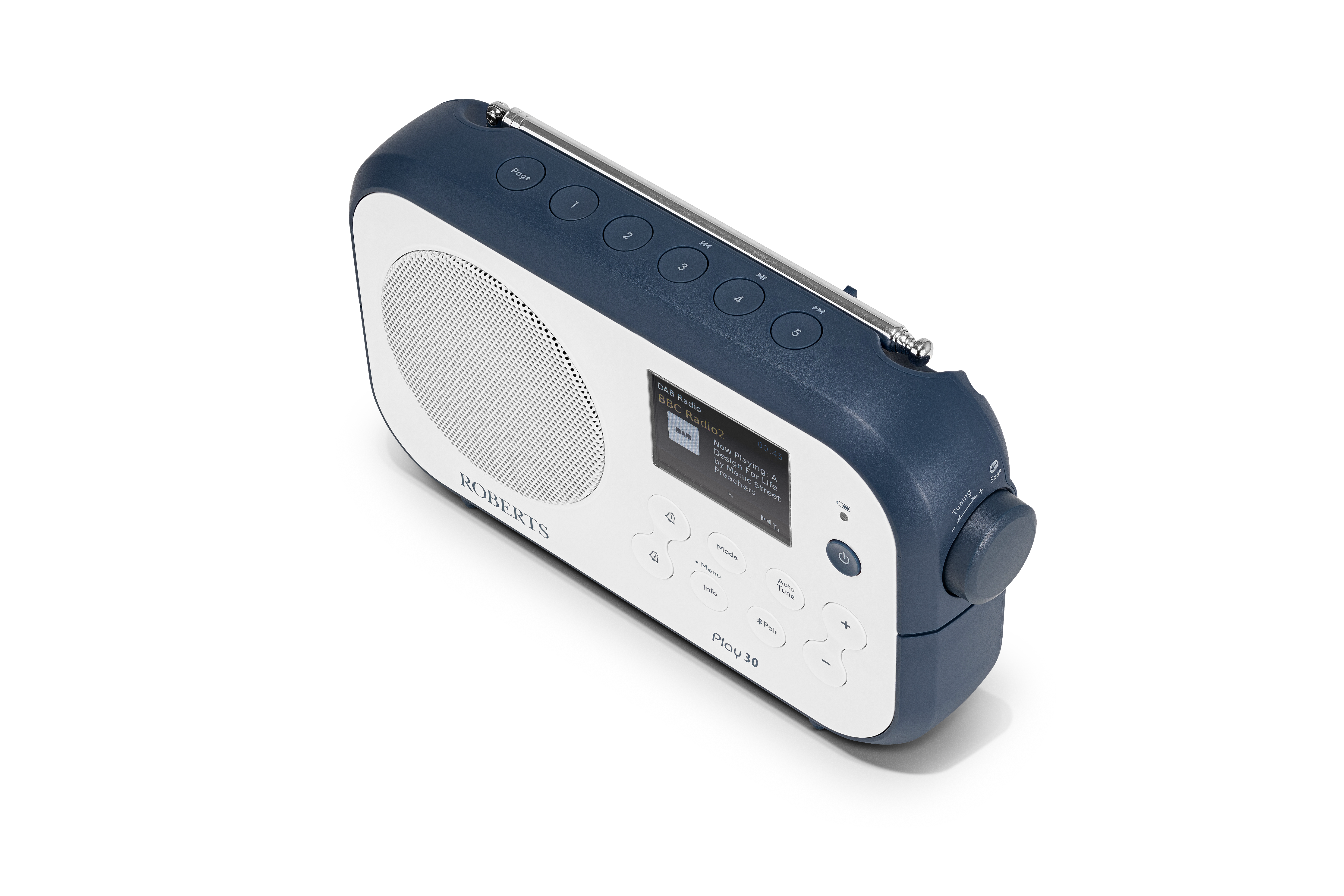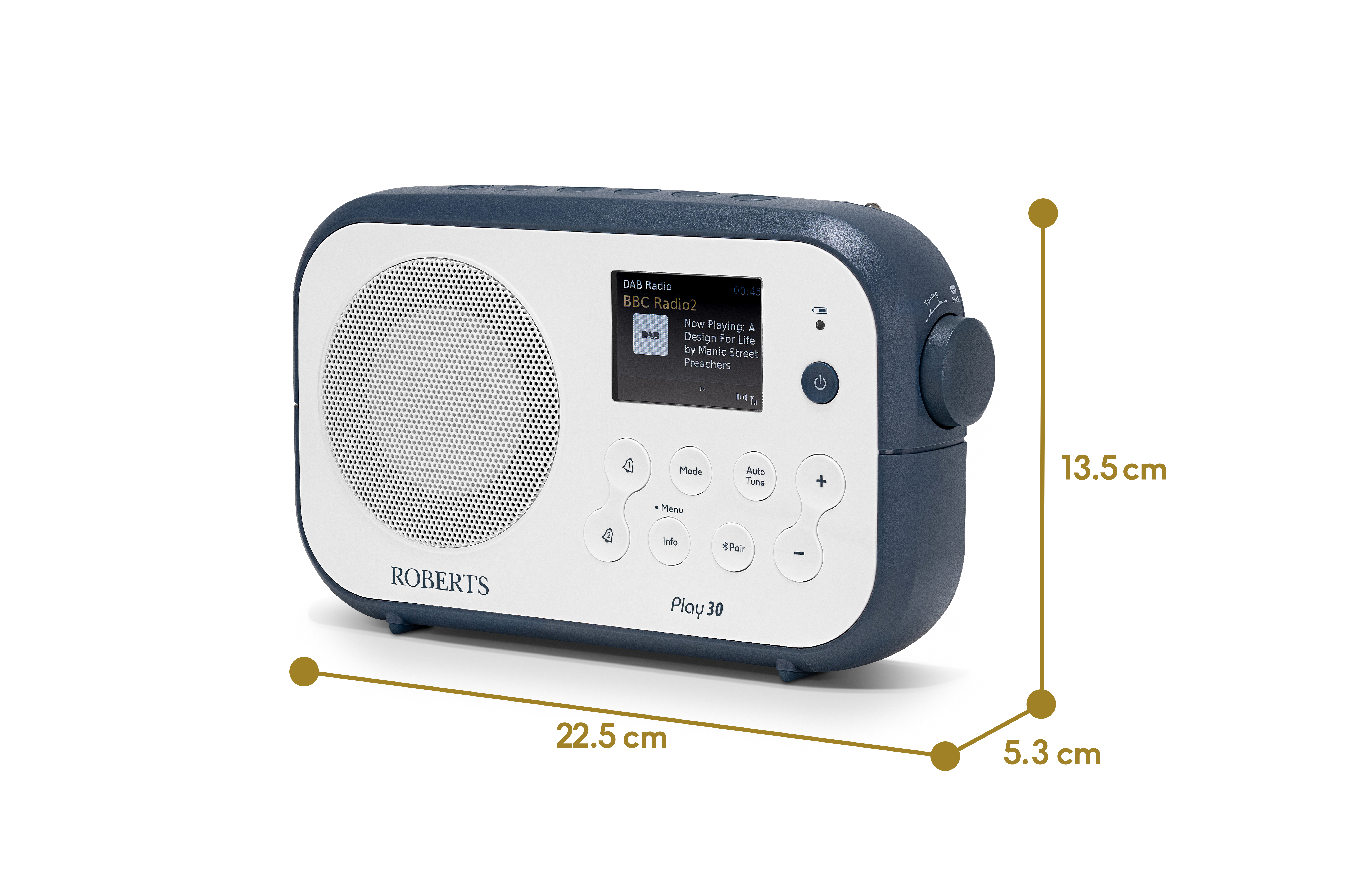 Wrapped in a chic white finish with a blue accent, the PLAY30WB radio looks as good as it sounds. Its bright colour display makes navigating features a breeze, adding a modern touch to your space. From bedside alarm to on-the-go sound machine, the Roberts PLAY30WB is your all-in-one audio companion.