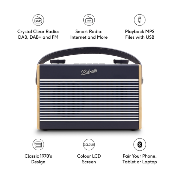 Roberts' RAMBLERMAXNB Rambler Max portable retro radio combines vintage aesthetics with modern audio technology. With iconic design and advanced features, this radio offers a superior listening experience whether you're at home or on the go. Enjoy a wide range of music and radio options with traditional radio, built in streaming services, and versatile connectivity.