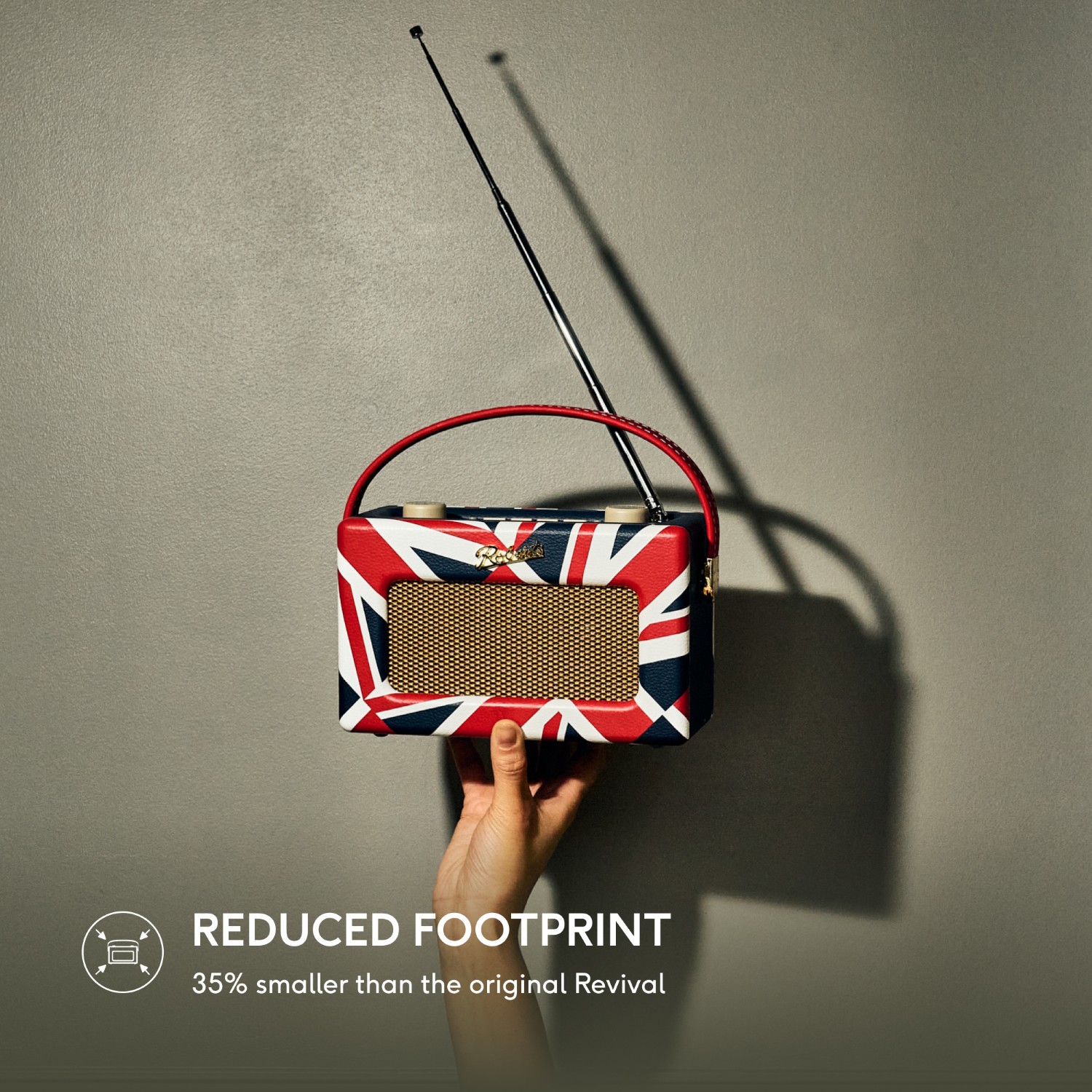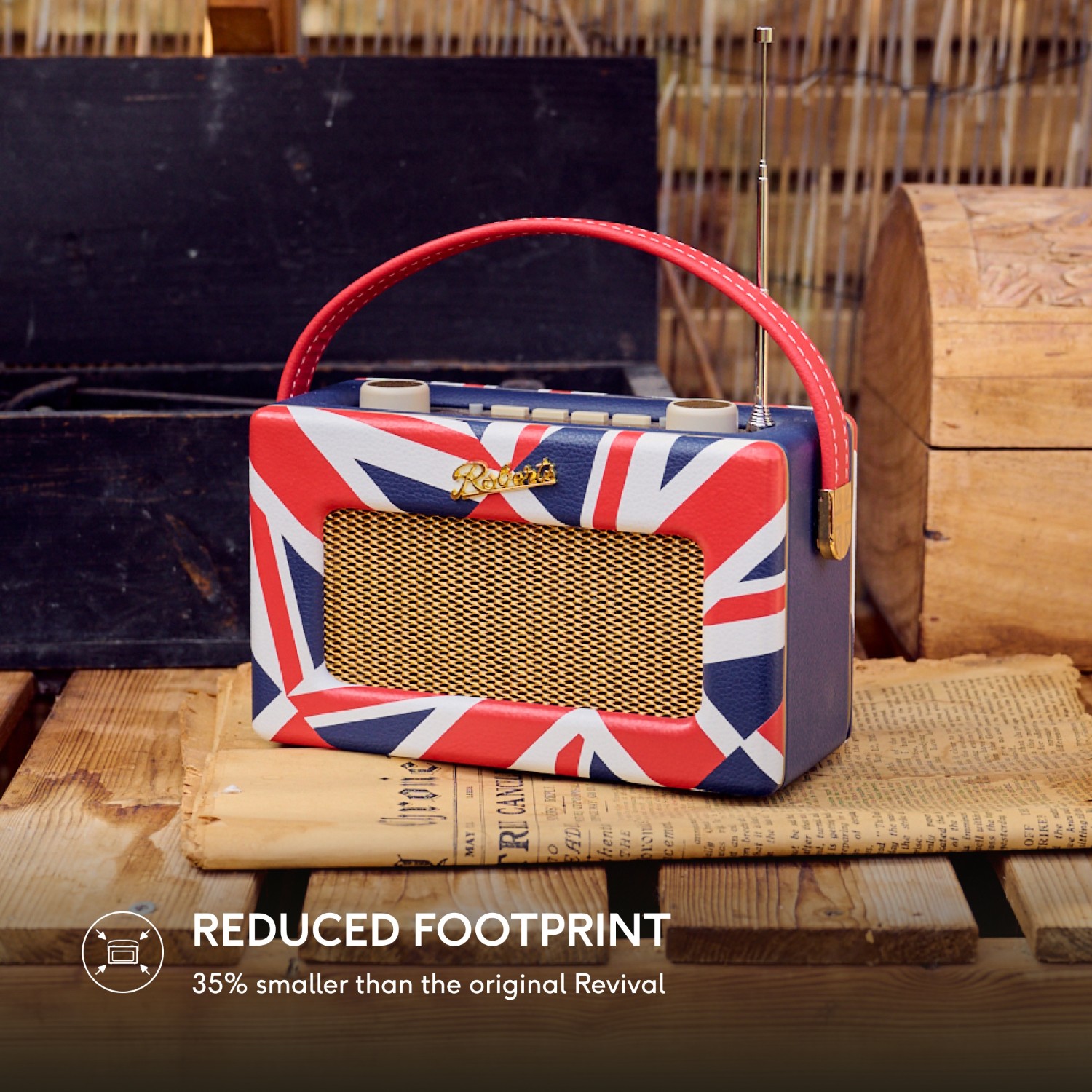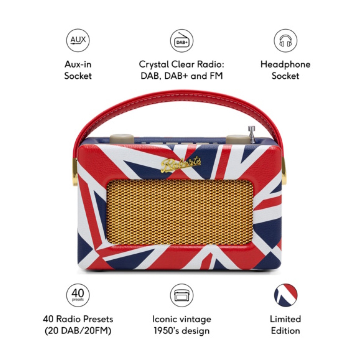 The Coronation Edition of the Revival Uno BT features a unique Union Jack geometric pattern, complete with engraved handle anchors showcasing the iconic flag. This special edition is not just a radio; it's a collector's item that commemorates a significant moment in history. The radio's design honors Roberts Radio's longstanding royal connection, having been the radio of choice for the British Royal Family for nearly 40 years.