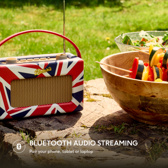 The Coronation Edition of the Revival Uno BT features a unique Union Jack geometric pattern, complete with engraved handle anchors showcasing the iconic flag. This special edition is not just a radio; it's a collector's item that commemorates a significant moment in history. The radio's design honors Roberts Radio's longstanding royal connection, having been the radio of choice for the British Royal Family for nearly 40 years.